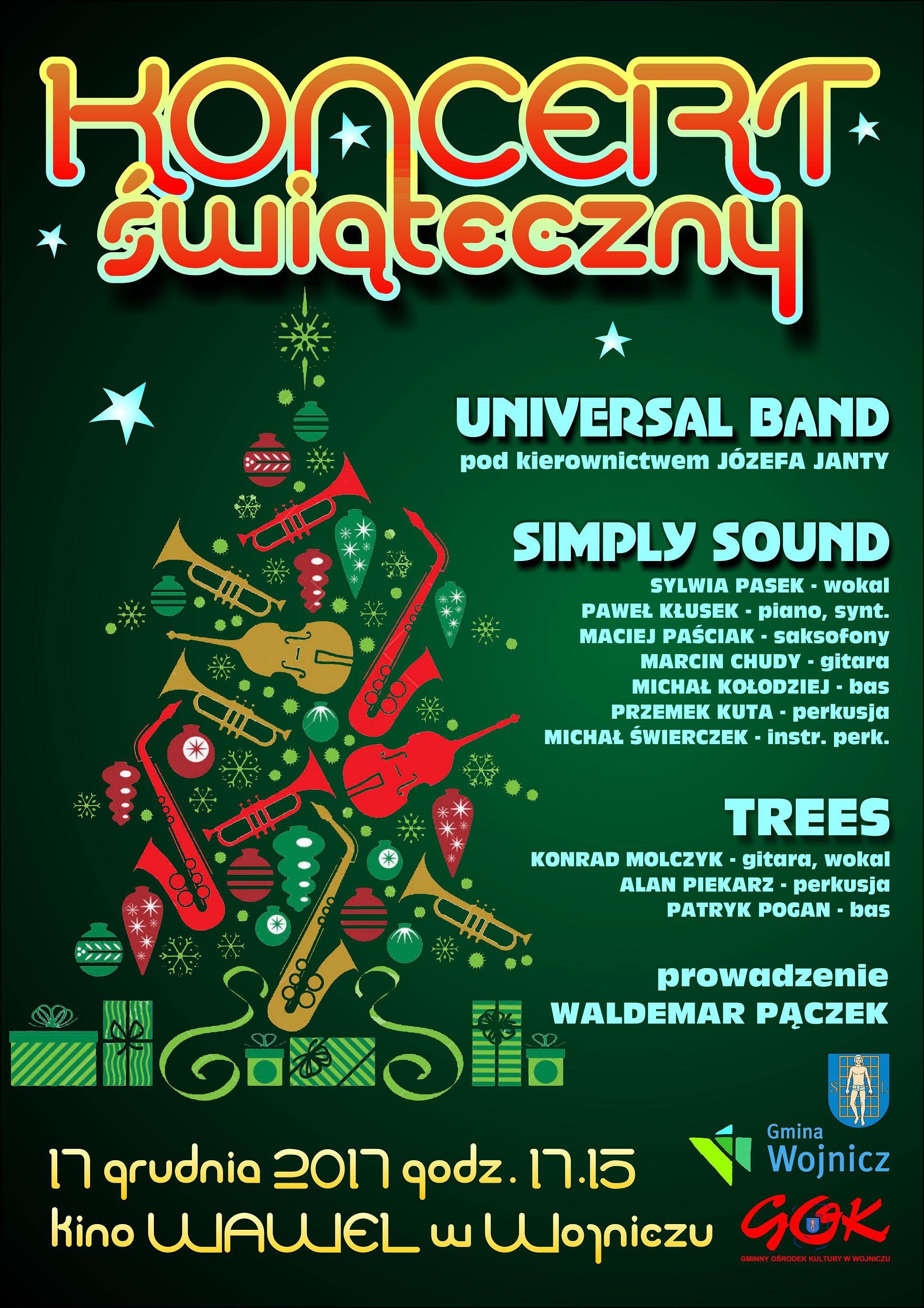 Gminny Ośrodek Kultury w Wojniczu serdecznie zaprasza na tradycyjny KONCERT ŚWIĄTECZNY, który odbędzie się 17 grudnia br. o godz. 17.15 w kinie WAWEL. W programie: UNIVERSAL BAND pod kierownictwem Józefa Janty, SIMPLY SOUND w składzie: Sylwia Pasek – wokal. Paweł Kłusek – piano, syntezatory, Maciej Paściak – saksofony, Marcin Chudy – gitara, Michał Kołodziej – bas, Przemek Kuta – perkusja, Michał Świerczek – instrumenty perkusyjne oraz zespół TREES w składzie: Konrad Molczyk – gitara, wokal, Alan Piekarz – perkusja, Patryk Pogan – bas. Prowadzenie – Waldemar Pączek. Wstęp wolny!