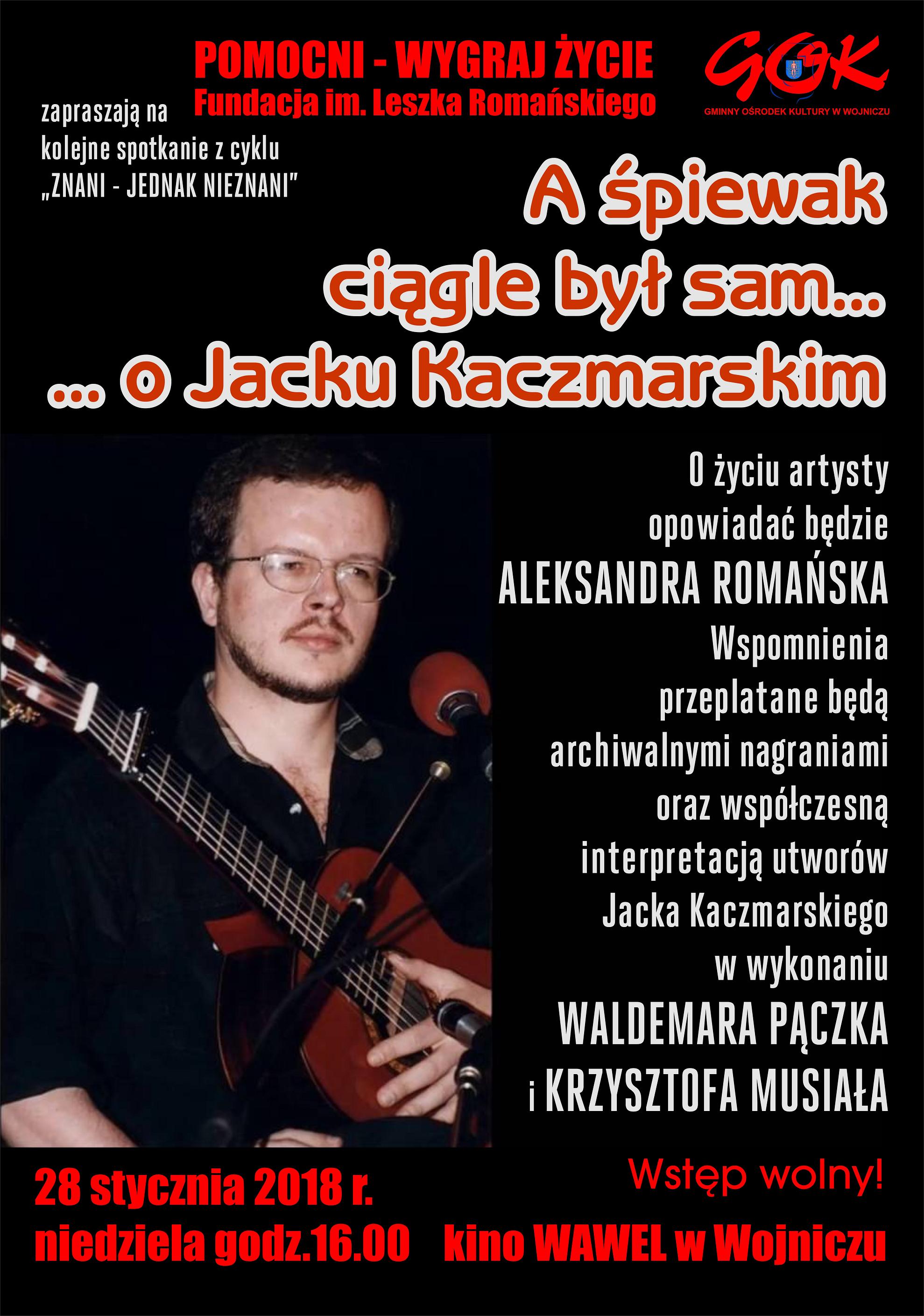 28 stycznia o godzinie 16 w kinie ,,Wawel” w Wojniczu odbędzie się kolejne spotkanie z cyklu ,,ZNANI – JEDNAK NIEZNANI”. Tym razem będzie ono dotyczyć życia i twórczości Jacka Kaczmarskiego.
