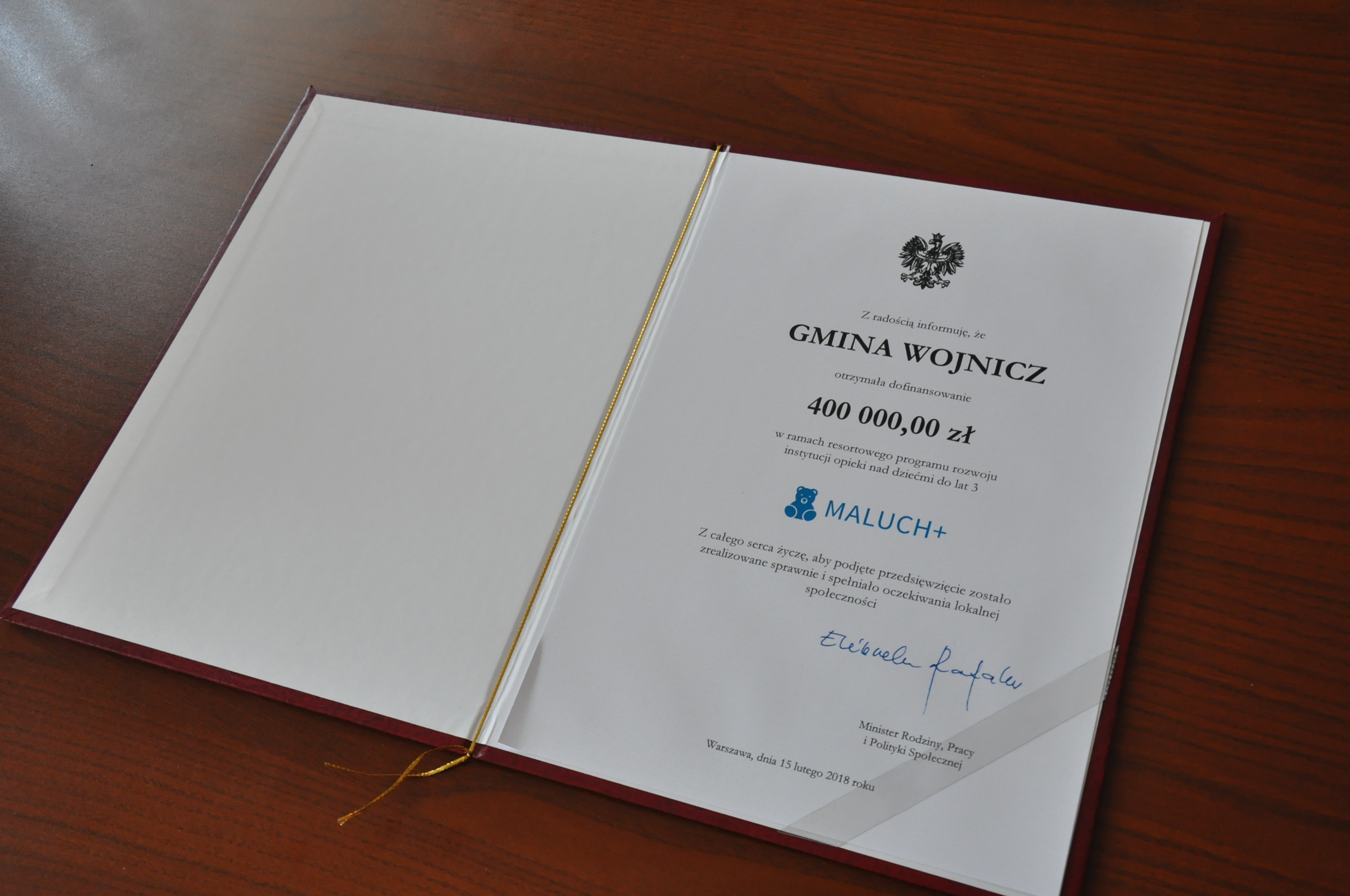 Gmina Wojnicz otrzymała dofinansowanie w wysokości 400 000 zł w ramach resortowego programu rozwoju instytucji opieki nad dziećmi do lat 3 ,,MALUCH +” Pieniądze przeznaczone są na utworzenie żłobka w Wojniczu. Inwestycja polega na dostosowaniu parteru budynku W Szkole Podstawowej w Wojniczu ul. Rynek 30 dla potrzeb funkcjonowania żłobka dla 20 dzieci, zawiera także prace dostosowawcze, pełne wyposażenie tego miejsca oraz zagospodarowanie części terenu wokół szkoły dla potrzeb dzieci w tym zapewnienie im placu zabaw .