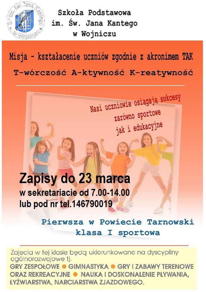 Do 23 marca będą trwać zapisy do pierwszej w Powiecie Tarnowskim klasy I sportowej w szkole Podstawowej im. Św. Jana Kantego w Wojniczu. Zapisów można dokonywać w sekretariacie szkoły od godz. 7:00 do 14:00 lub pod nr telefonu: 14 6790 019.