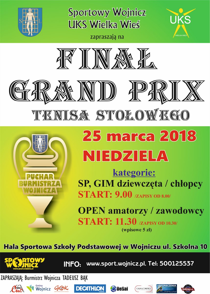 Już w niedzielę 25 marca zapraszamy na halę sportową Szkoły Podstawowej w Wojniczu na FINAŁ GRAND PRIX TENISA STOŁOWEGO Zapisy od 8:00, początek gier o 9:00. Zagramy na 9, stołach. w 6 kategoriach. Za zwycięstwo w dniu 25 marca mamy symboliczne statuetki, a za zwycięstwo całego cyklu okazałe puchary i nagrody rzeczowe. ZAPRASZAMY