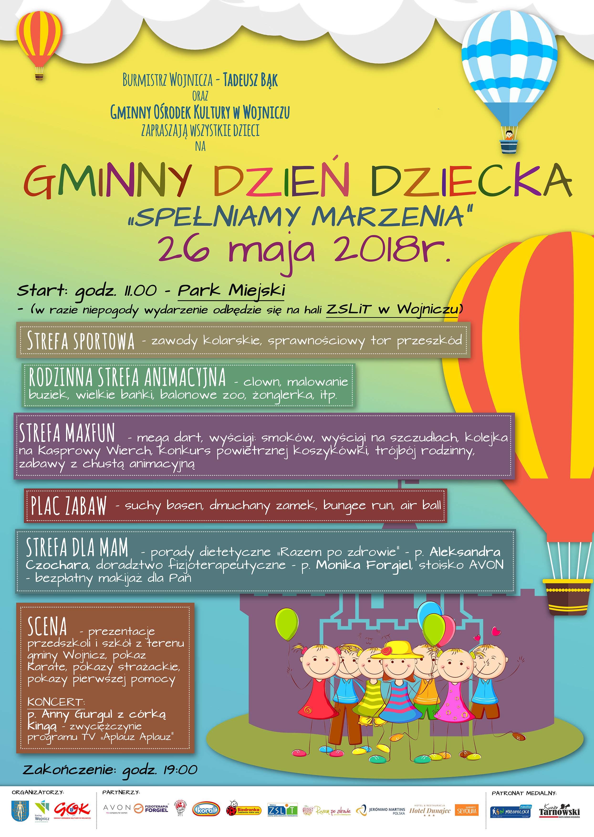 Burmistrz Wojnicza oraz Gminny Ośrodek Kultury w Wojniczu serdecznie zapraszają na Gminny Dzień Dziecka „SPEŁNIAMY MARZENIA”, który odbędzie się 26 maja br. Rozpoczęcie o godzinie 11:00 w Parku Miejskim. W razie niepogody wydarzenie zostanie przeniesione do hali ZSLiT w Wojniczu. W programie przewidzianych jest wiele darmowych atrakcji dla dzieci oraz dorosłych.