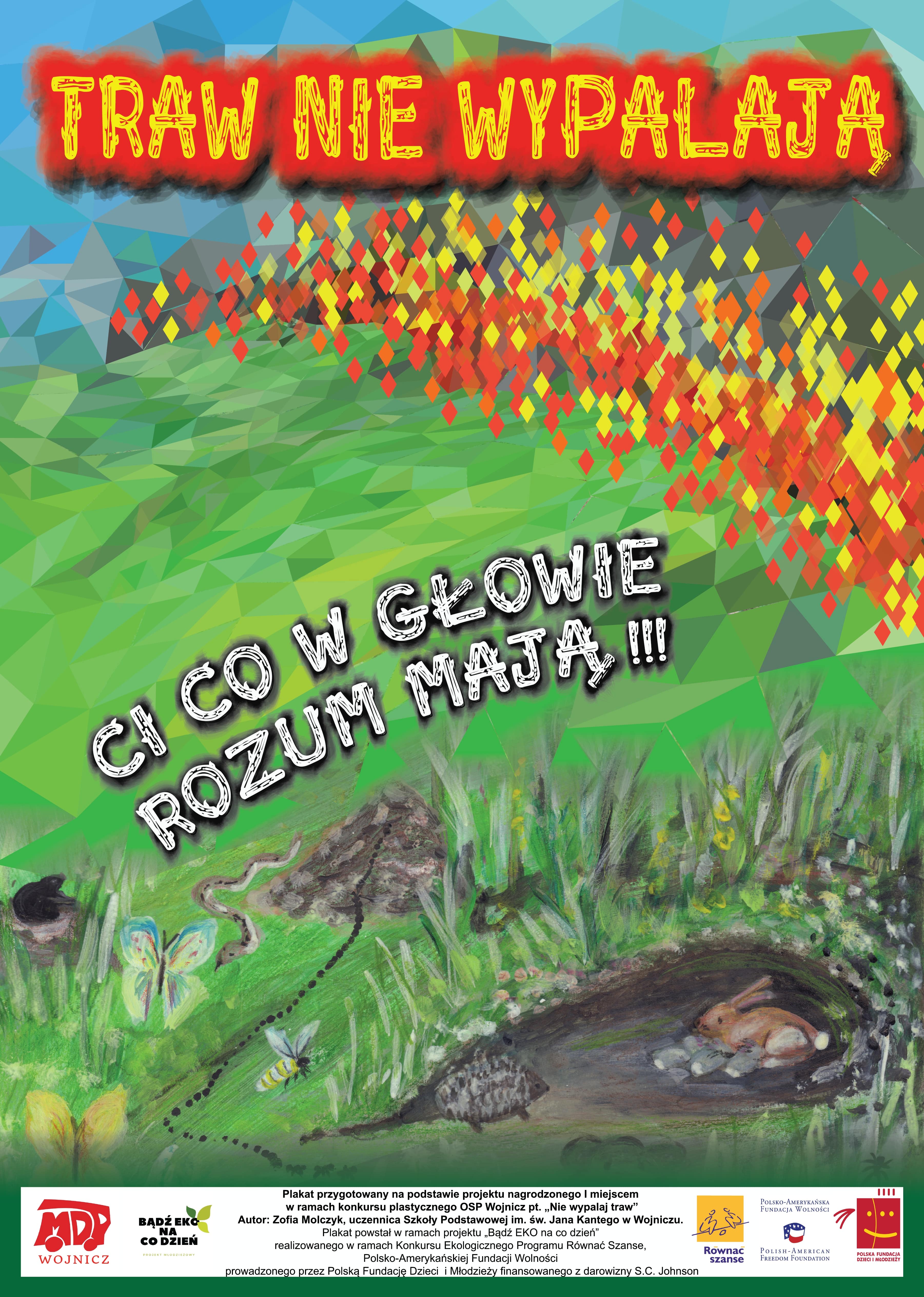 W styczniu z nową energią – jak to na początek nowego roku przystało – członkowie MDP Wojnicz przystąpili do pracy nad kolejną projektową inicjatywą – konkursem plastycznym na plakat informacyjny dot. wypalania traw. Tu pracy było sporo – młodzi wspólnie ustalili regulamin konkursu, skład komisji konkursowej, opracowali plakaty promujące konkurs, zadbali by informacja o konkursie dotarła do każdej szkoły z terenu gminy Wojnicz. Wspólnie wybrali nagrody dla osób, które zajęły 3 pierwsze miejsca i dla autorów 3 wyróżnionych prac. 15 lutego w trakcie spotkania wybrali najlepsze prace, a plakat autorstwa Zofii Molczyk posłużył jako projekt plakatu informacyjnego, który został wydrukowany i umieszczony na tablicach informacyjnych w całej gminie. Plakat został również opublikowany na profilach fb OSP Wojnicz, gdzie cieszy się nie lada zainteresowaniem – na chwilę obecną statystyki pokazują, że widziało go już 10 tysięcy osób, a 40 udostępniło go dalej.