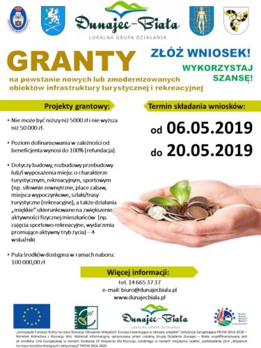 Wszelkie niezbędne informacje dotyczące naboru znajdują się na stronie internetowej www.dunajecbiala.pl oraz udzielane są w Biurze Lokalnej Grupy Działania Dunajec-Biała lub pod numerem tel. 14 665 37 37 w godz. od 7:45 do 15:45 w poniedziałki, wtorki, czwartki i piątki, a w środy od 10:00 do 18:00 bądź pod adresem e-mail: biuro@dunajecbiala.pl