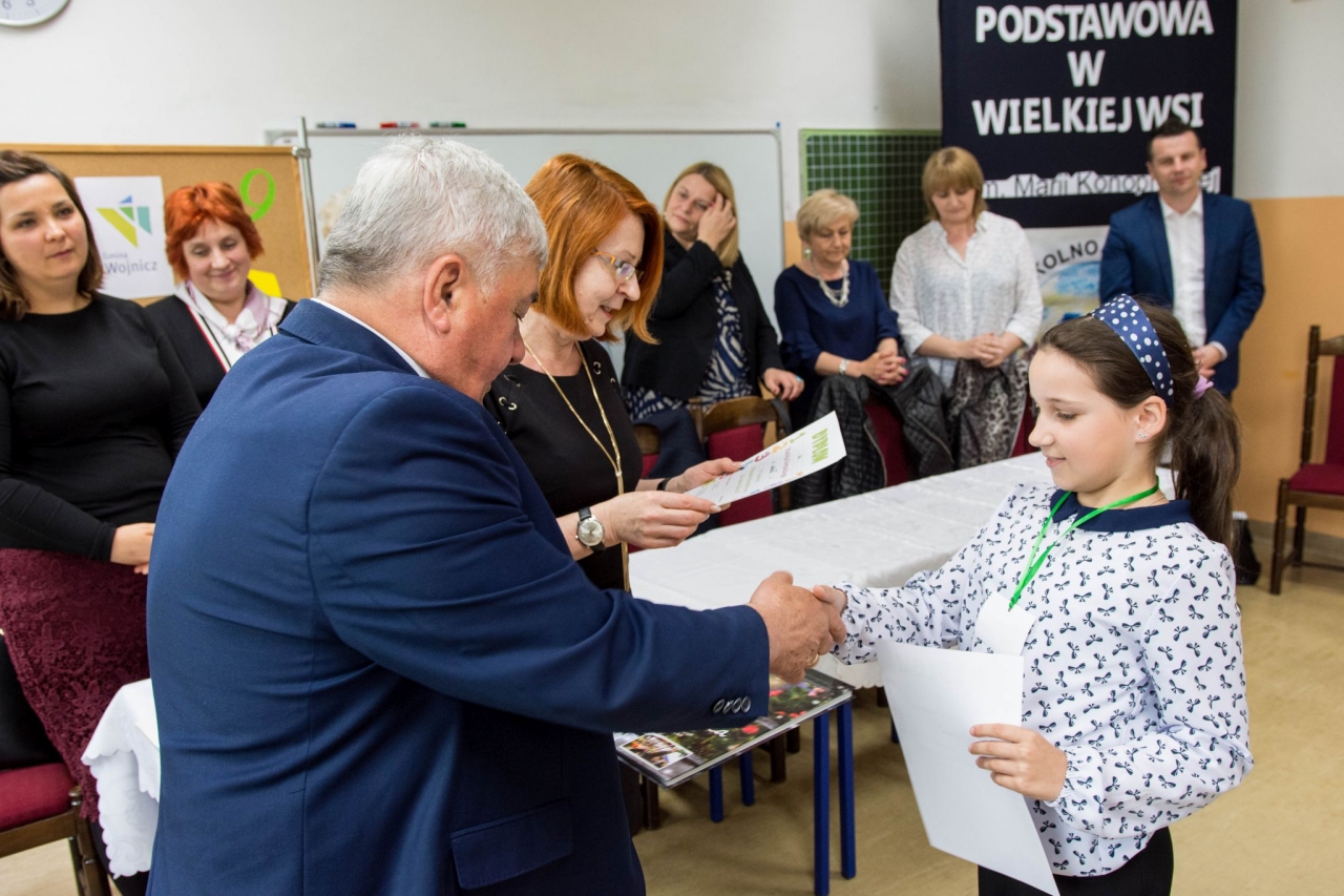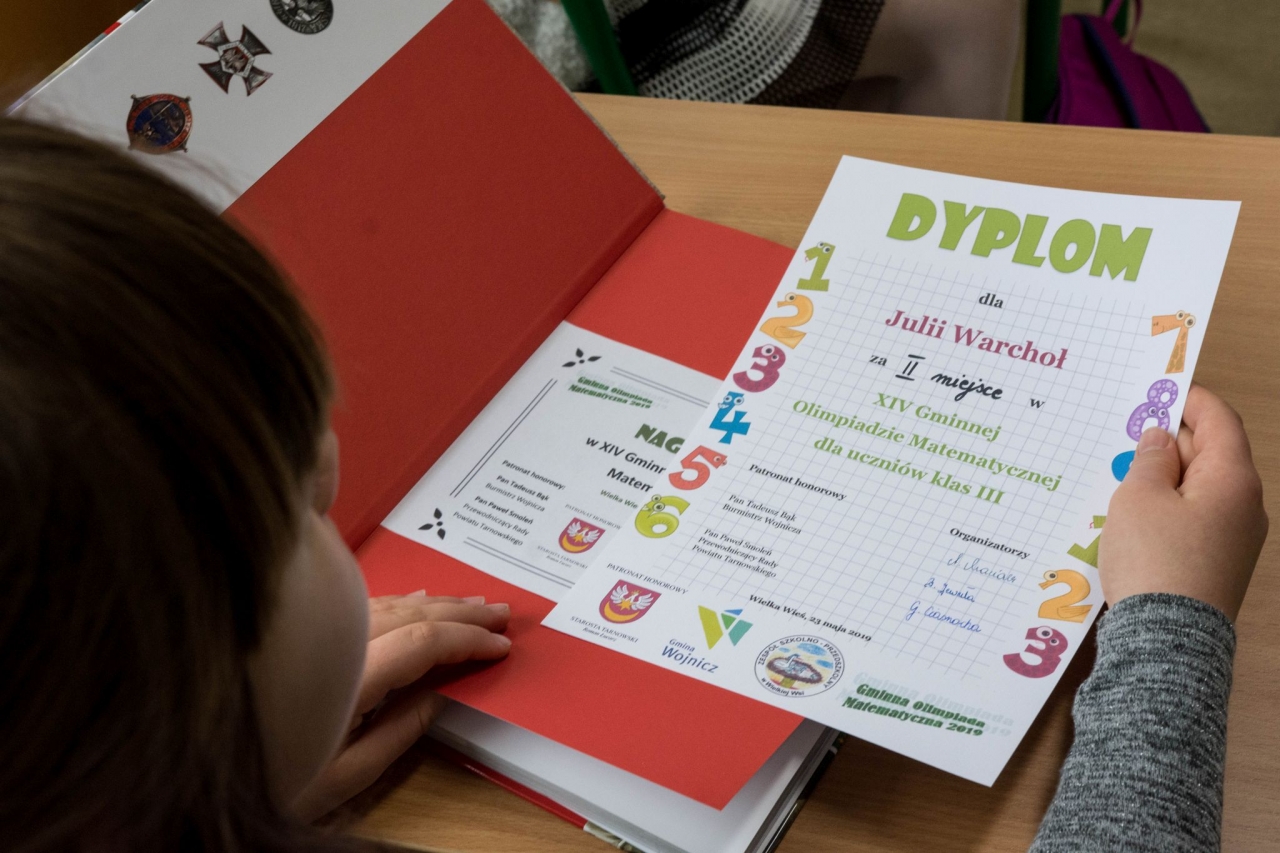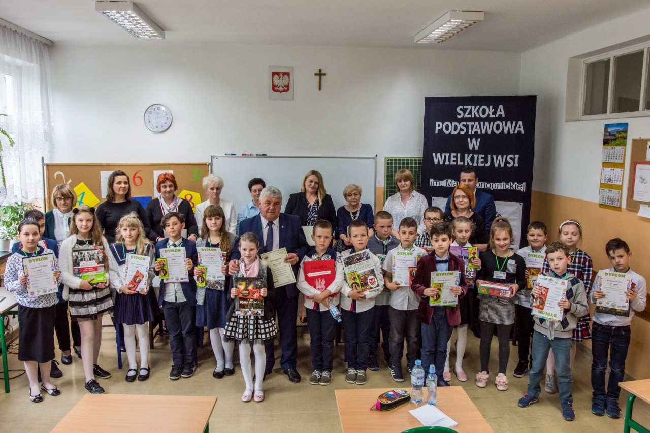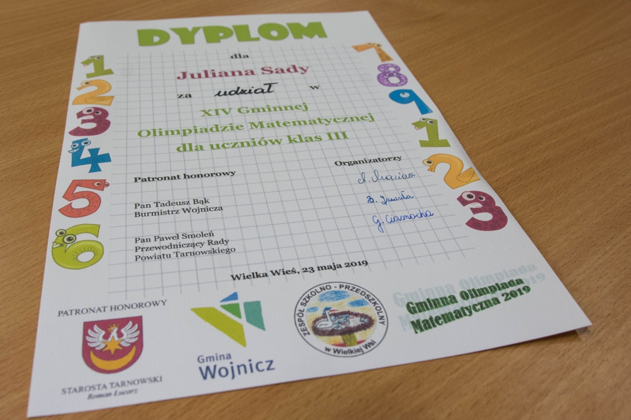 Dnia 23 maja 2019 roku w Zespole Szkolno – Przedszkolnym w Wielkiej Wsi już po raz czternasty odbyła się Gminna Olimpiada Matematyczna dla uczniów klas trzecich pod patronatem Burmistrza Wojnicza Pana Tadeusza Bąka, Przewodniczącego Rady Powiatu Pana Pawła Smolenia oraz Starosty Tarnowskiego Pana Romana Łucarza.