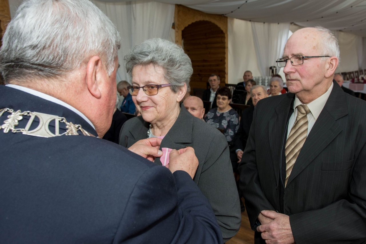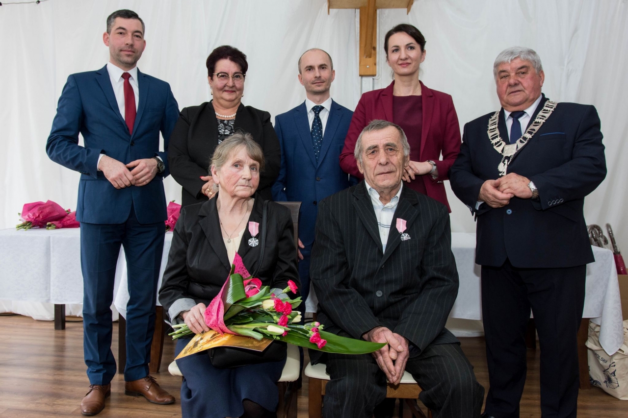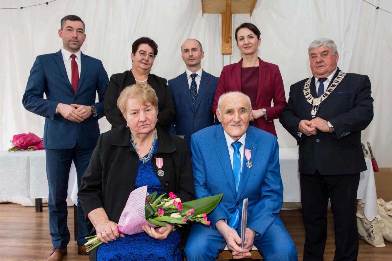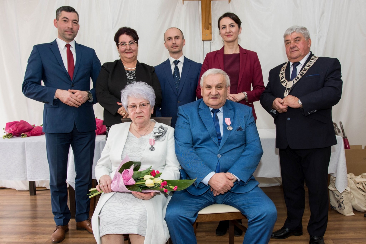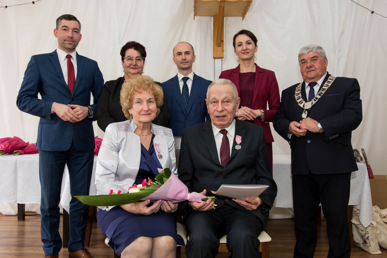 Po swoim wystąpieniu wspólnie z zastępcą Leszkiem Ząbkowskim dokonali aktu dekoracji medalami nadanymi przez Prezydenta Rzeczypospolitej Polskiej dla osób, które przeżyły 50 lat w jednym związku małżeńskim, w dowód społecznego uznania dla trwałości małżeństwa i rodziny. Medal otrzymało 29 par małżeńskich. Następnie wspólnie z Panią Joanną Zając Skarbnik Gminy oraz Panią Agnieszka Dąbroś Sekretarz Gminy wręczyli wszystkim Jubilatom listy gratulacyjne i piękne bukiety kwiatów.