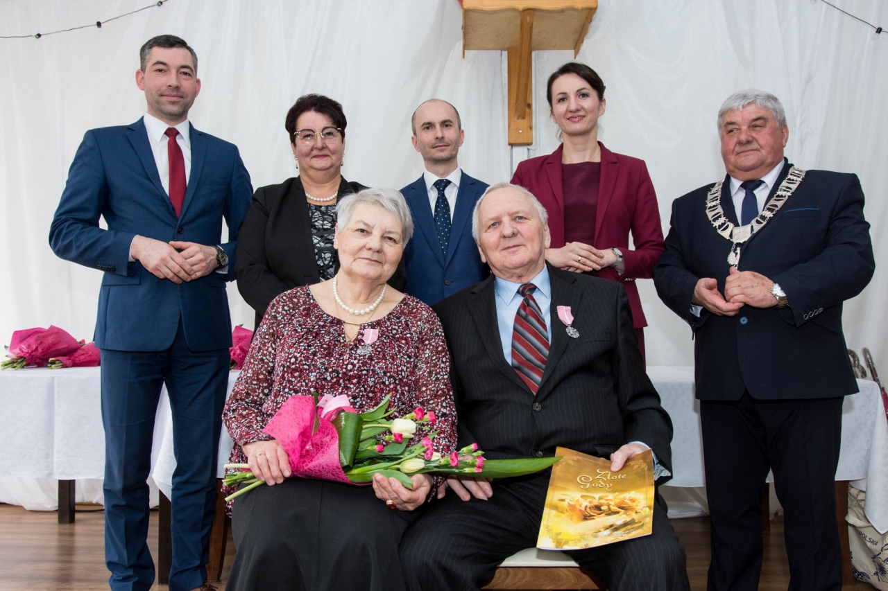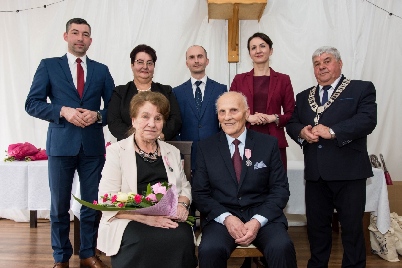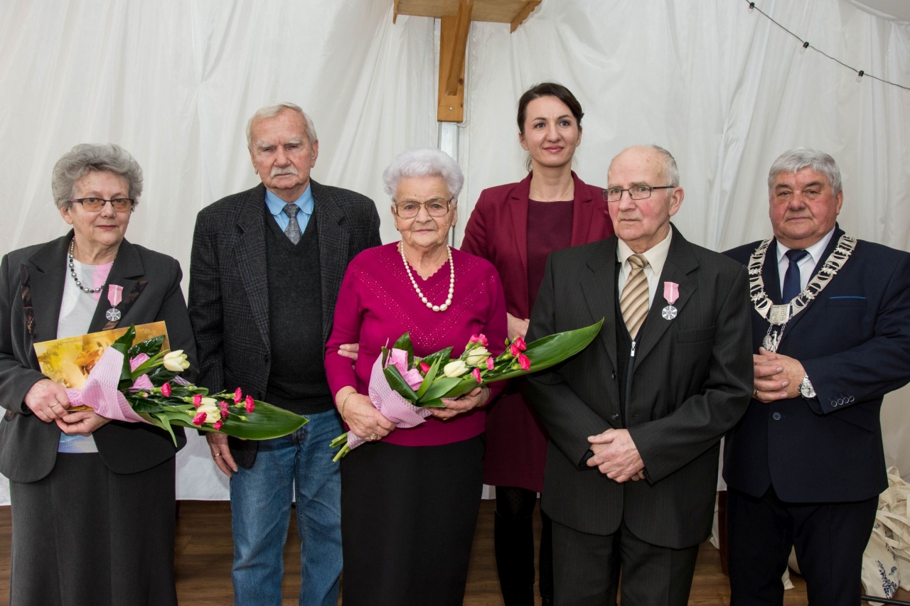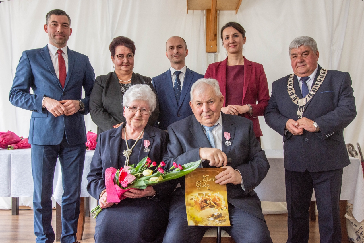 Po swoim wystąpieniu wspólnie z zastępcą Leszkiem Ząbkowskim dokonali aktu dekoracji medalami nadanymi przez Prezydenta Rzeczypospolitej Polskiej dla osób, które przeżyły 50 lat w jednym związku małżeńskim, w dowód społecznego uznania dla trwałości małżeństwa i rodziny. Medal otrzymało 29 par małżeńskich. Następnie wspólnie z Panią Joanną Zając Skarbnik Gminy oraz Panią Agnieszka Dąbroś Sekretarz Gminy wręczyli wszystkim Jubilatom listy gratulacyjne i piękne bukiety kwiatów.
