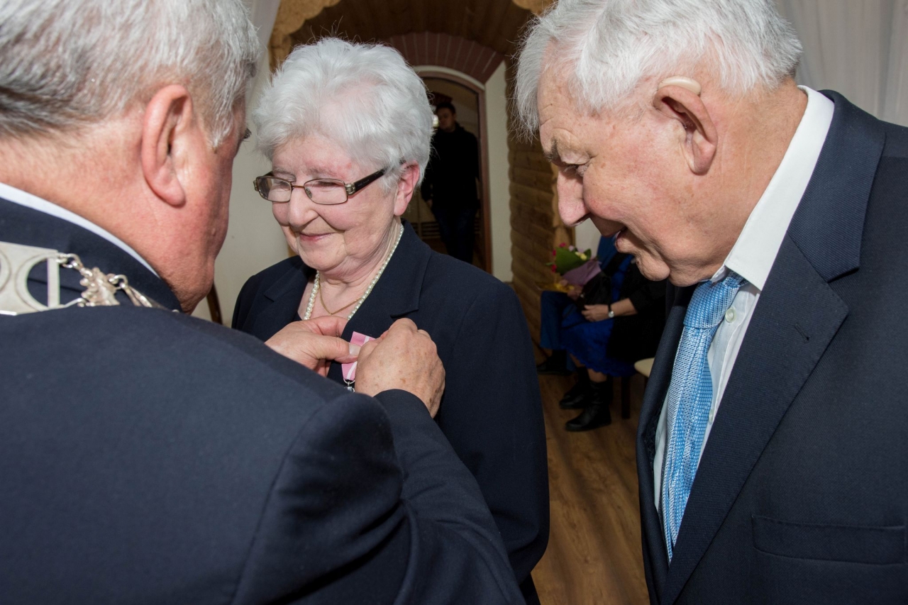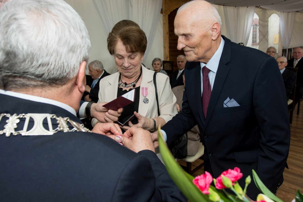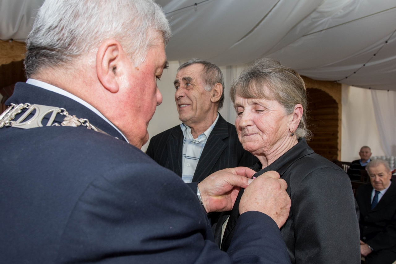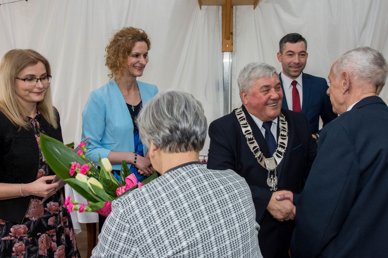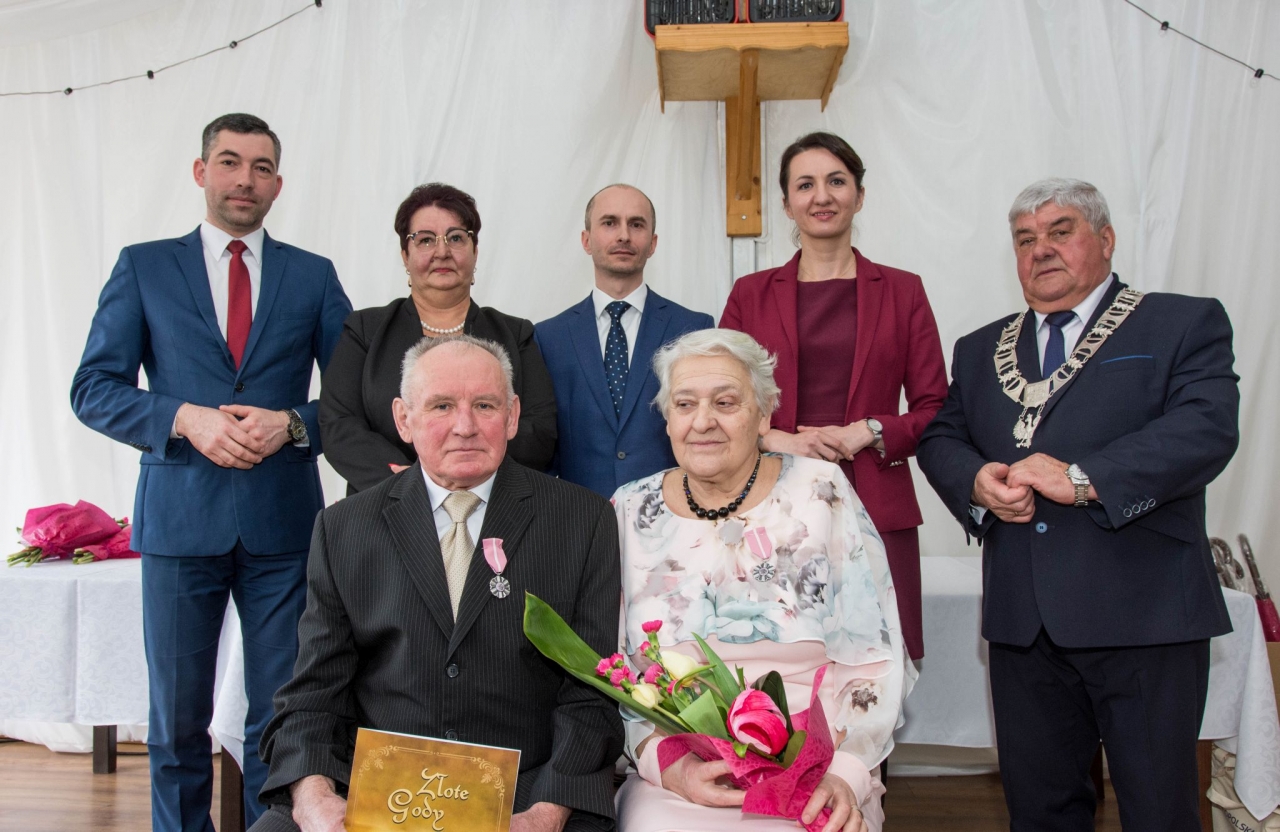 Po swoim wystąpieniu wspólnie z zastępcą Leszkiem Ząbkowskim dokonali aktu dekoracji medalami nadanymi przez Prezydenta Rzeczypospolitej Polskiej dla osób, które przeżyły 50 lat w jednym związku małżeńskim, w dowód społecznego uznania dla trwałości małżeństwa i rodziny. Medal otrzymało 29 par małżeńskich. Następnie wspólnie z Panią Joanną Zając Skarbnik Gminy oraz Panią Agnieszka Dąbroś Sekretarz Gminy wręczyli wszystkim Jubilatom listy gratulacyjne i piękne bukiety kwiatów.