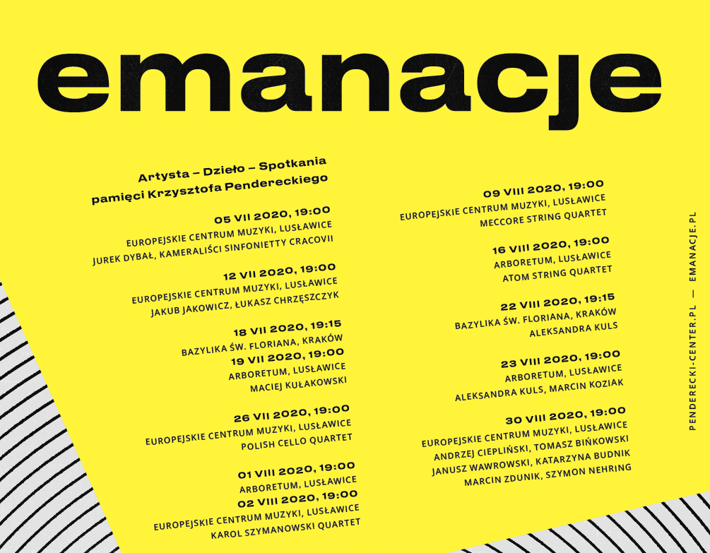 Festiwal Emanacje potrwa do 30 sierpnia. Szczegółowy program oraz informacje o biletach można znaleźć na stronie: www.penderecki-center.pl w zakładce EMANACJE.