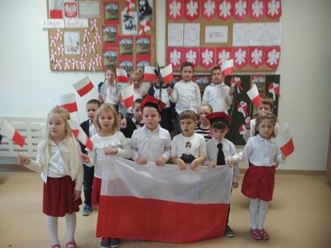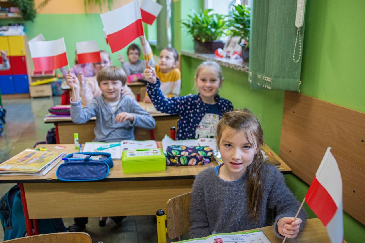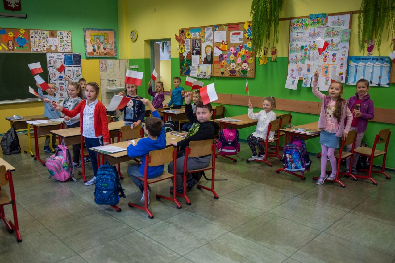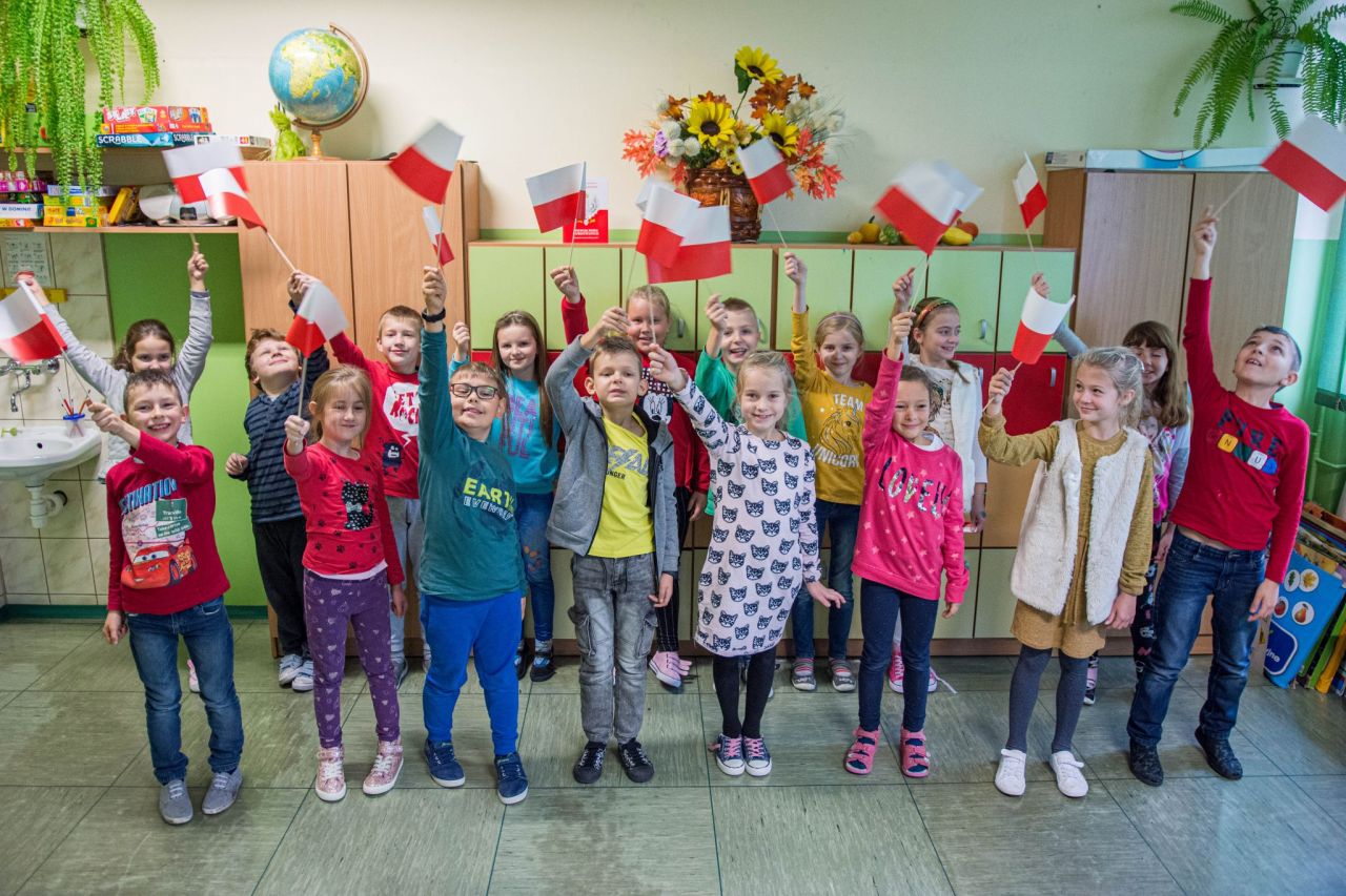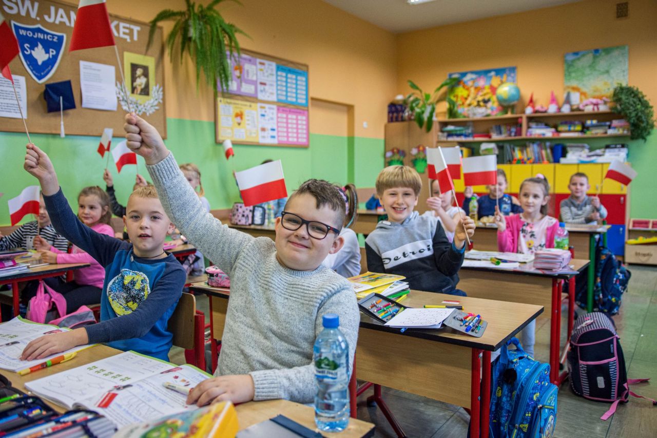Tegoroczne Święto Niepodległości społeczność Szkoły Podstawowej w Wojniczu zdecydowała się uczcić w przestrzeni zamkniętej z uwagi na wciąż obowiązujący w naszym kraju stan epidemii. W ramach obchodów w szkole uczniom zostały rozdane okolicznościowe materiały takie jak: śpiewniki, biało-czerwone chorągiewki, naklejki, plakietki i ulotki otrzymane z projektu „Młodzież pamięta”, który co roku realizowany jest w Małopolsce w czasie obchodów Święta Niepodległości i ma na celu zwrócenie uwagi – szczególnie ludzi młodych – jak ważna jest narodowa pamięć i patriotyczna tradycja, a zarazem pokazać społeczeństwu, że młodzież pamięta o najważniejszych wydarzeniach w historii Polski.