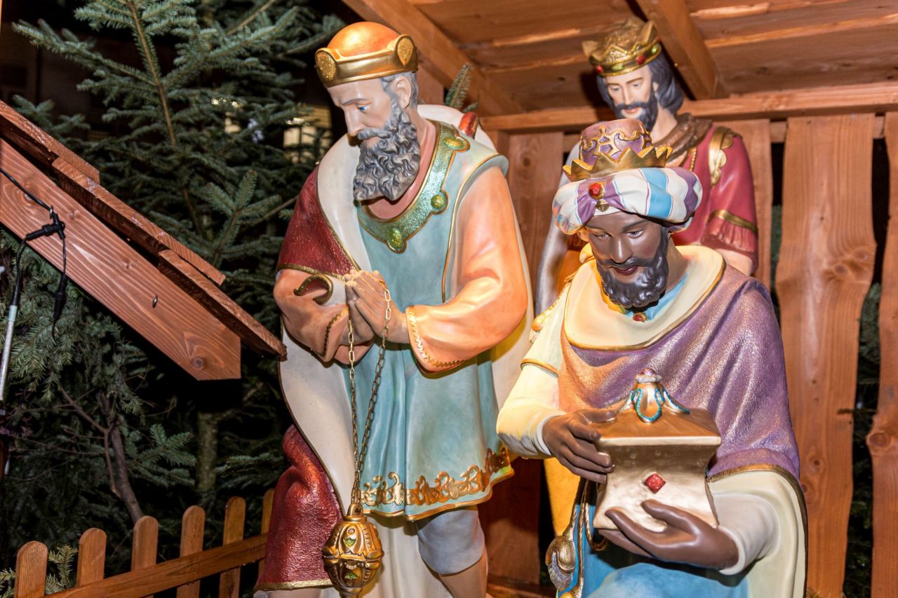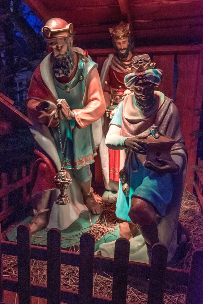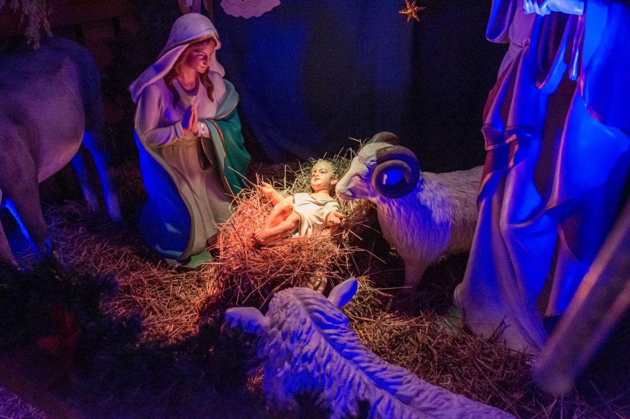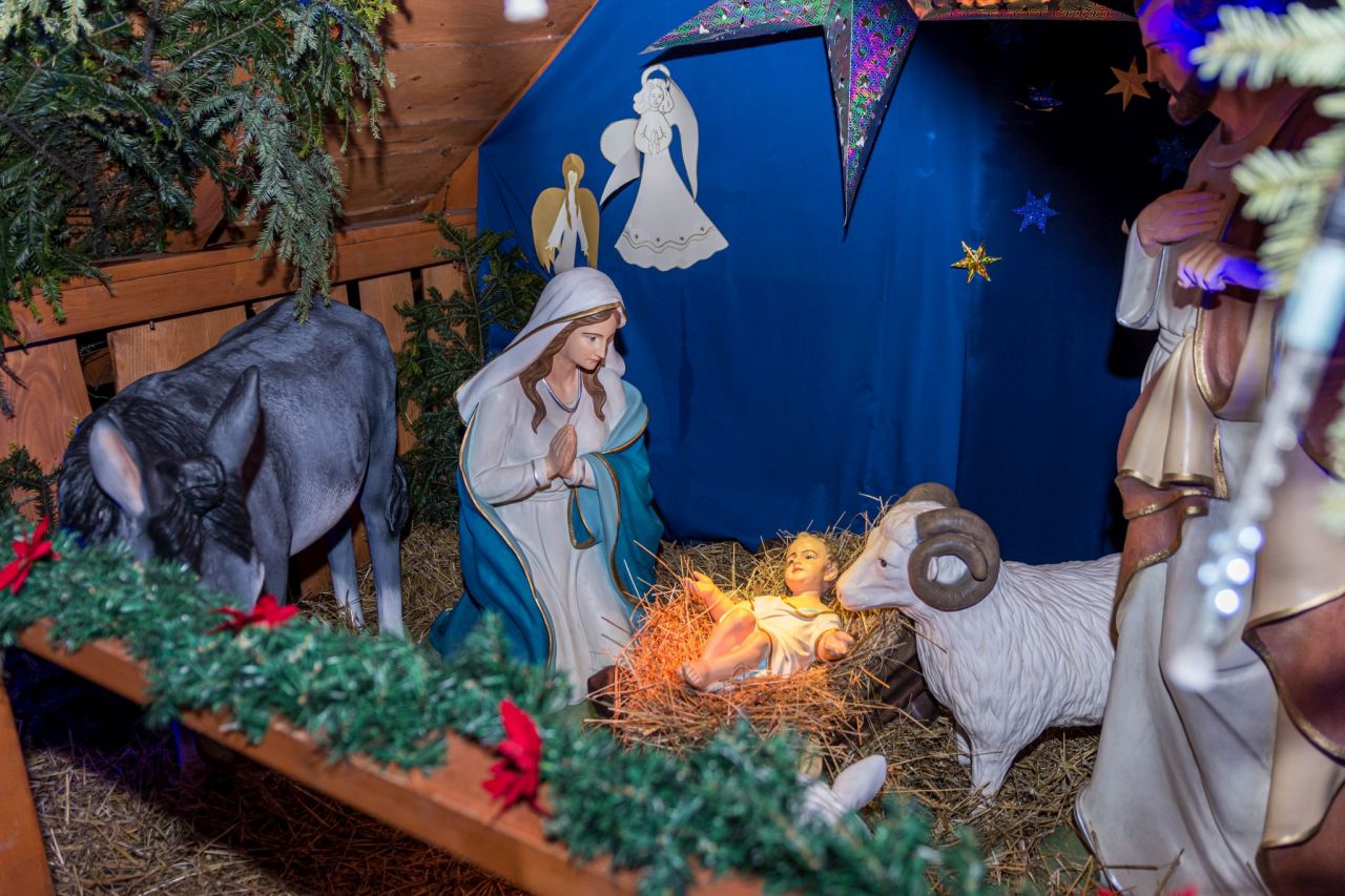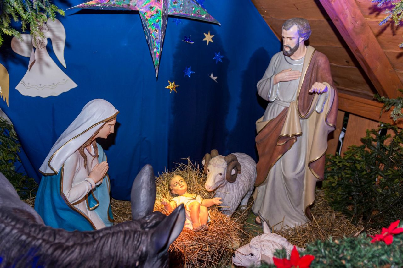 Szopkę tworzą figury Matki Boskiej, Józefa, dzieciątka Jezus, aniołów, zwierząt oraz figury trzech króli.