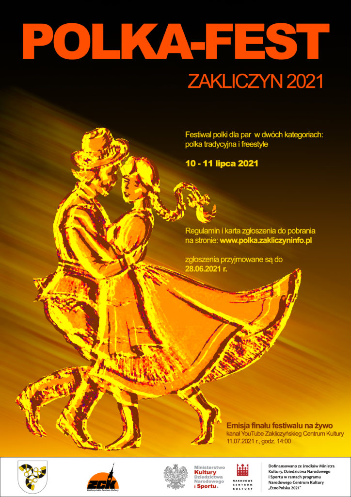 Zakliczyńskie Centrum Kultury i Gmina Zakliczyn zapraszają do udziału w Festiwalu Polki „POLKA-FEST” Zakliczyn 2021 skierowanego do par tanecznych, dofinansowanego ze środków Ministra Kultury, Dziedzictwa Narodowego i Sportu w ramach programu Narodowego Centrum Kultury „EtnoPolska 2021”. Festiwal odbędzie się w dniach 10-11 lipca 2021 roku na Państwa zgłoszenia czekamy do 28 czerwca 2021 roku szczegóły znajdują się w regulaminie.