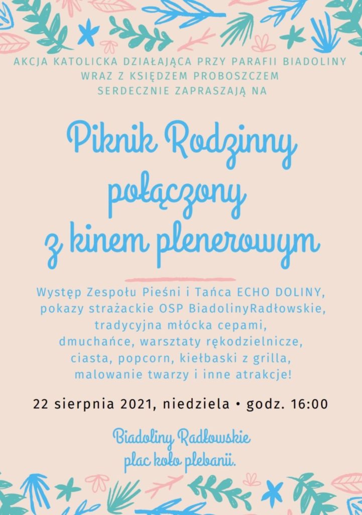 Początek wydarzenia na placu koło plebani w Biadolinach Radłowskich w niedzielę 22 sierpnia o godz. 16:00. Organizatorzy przewidzieli liczne atrakcje m. in. dmuchańce, malowanie twarzy, kiełbaski z grilla, warsztaty rękodzielnicze i inne atrakcje. Dodatkową atrakcją pikniku jest kino plenerowe.
