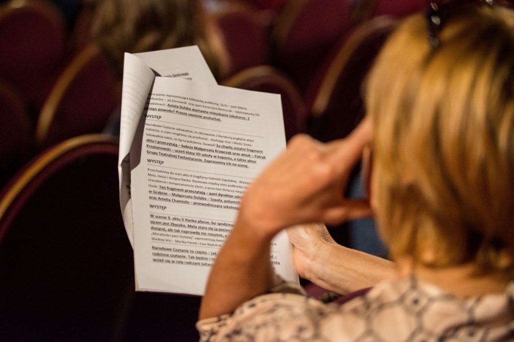 „Moralność Pani Dulskiej” z podziałem na role odczytali: Zastępca Burmistrza Leszek Ząbkowski, Skarbnik Gminy Joanna Zając, Sekretarz Gminy Agnieszka Dąbroś, Dyrektor Niepublicznego Przedszkola w Wojniczu „Mój Mały Świat” Marzena Śliwa, Dyrektor Zespołu Szkół Licealnych i Technicznych w Wojniczu Agnieszka Kapek, Kierownik Referatu Edukacji Agnieszka Brożek, Przedstawiciel Rady Duszpasterskiej działającej przy parafii w Wojniczu Władysław Piasecki, Kierownik Gminnej Biblioteki Publicznej w Wojniczu Marta Chemłowska, Dyrektor Szkoły Podstawowej w Grabnie Małgorzata Dulęba-Szpala, Prezes Stowarzyszenia Łukanowice „Aktywni Razem” Joanna Fido oraz sekretarz tego stowarzyszenia Agnieszka Przeklasa. Ponadto w czytaniu wzięli również udział: Dominika Kubisztal, Magdalena i Katarzyna Sowa, Mirosław Grzegórzek, Katarzyna Niemczyk, Małgorzata Krawczyk, Patryk Krzyżanowski, Anna Kelner, Amelia Chamioło, Marika Panek, Ewa Nadolnik, Elżbieta i Zuzanna Krzyżanowska, Maja Chumięcka, Wiktoria Tomaszewska, Julia Wolak oraz Agnieszka Sowa.