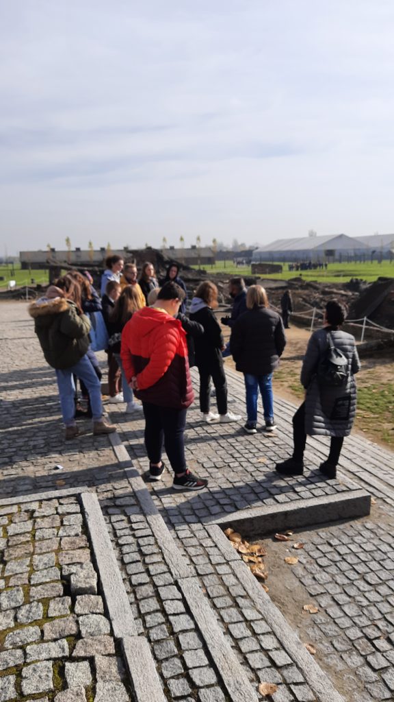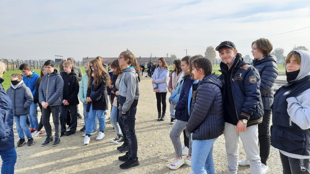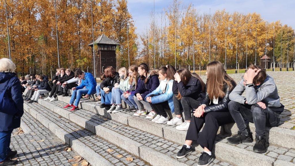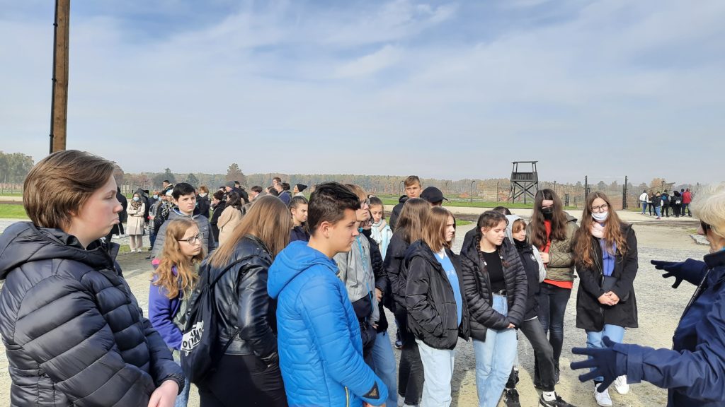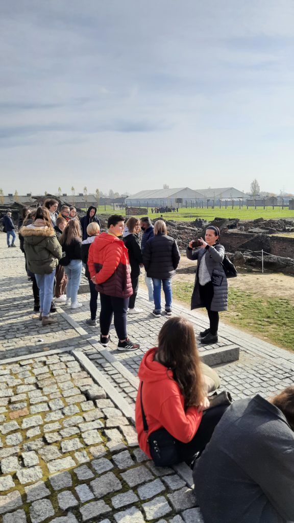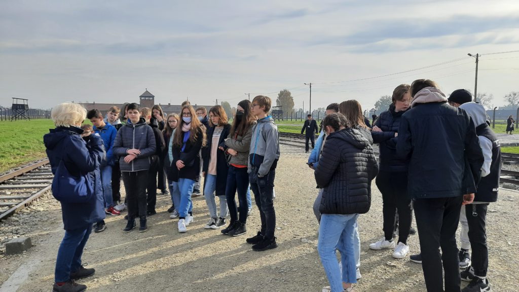 Pierwszym punktem programu było zwiedzanie Miejsca Pamięci i Muzeum – Auschwitz-Birkenau. Uczniowie w wielkim skupieniu i z przejęciem wysłuchali przewodnika-edukatora, który przedstawił im historię byłego niemieckiego obozu koncentracyjnego, opowiedział o ludobójstwie i nieludzkim traktowaniu więźniów. Do wyobraźni przemawiały autentyczne, zachowane w formie niezmienionej od zakończenia wojny miejsca, a także nowoczesne wystawy przygotowane z myślą o młodych ludziach. Pobyt w Auschwitz wywarł na ósmoklasistach wstrząsające wrażenie i z pewnością na zawsze zostanie w pamięci.