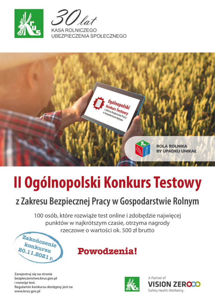 Kasa Rolniczego Ubezpieczenia Społecznego organizuje II Ogólnopolski Konkurs testowy z Zakresu Bezpiecznej Pracy w Gospodarstwie Rolnym – Rola Rolnika, by upadku unikał. Konkurs przebiegał będzie w formule on-line. Pytania konkursowe będą weryfikować wiedzę uczestników dotyczącą wypadków w gospodarstwie rolnym, ze szczególnym uwzględnieniem zagadnień związanych z upadkami osób. Konkurs trwał będzie do 20 listopada 2021 roku. 100 uczestników którzy zdobędą największą ilość punktów w najkrótszym czasie otrzyma nagrody rzeczowe – myjki ciśnieniowe. Szczegółowe zasady uczestnictwa w konkursie określa regulamin dostępny na stronie internetowej KRUS – www.krus.gov.pl