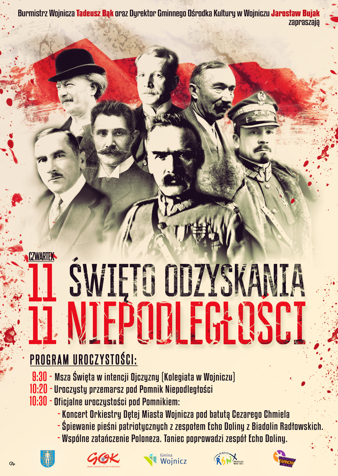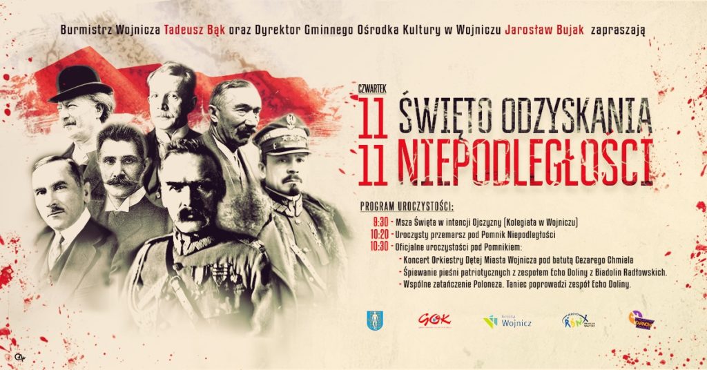 Burmistrz Wojnicza Tadeusz Bąk oraz Jarosław Bujak – Dyrektor Gminnego Ośrodka Kultury w Wojniczu zapraszają na uroczystości z okazji Narodowego Święta Niepodległości. Uroczystości rozpoczniemy mszą świętą w intencji Ojczyzny. Następnie udamy się pod Pomnik Niepodległości aby złożyć wieńce, kwiaty oraz wspólnie zaśpiewać pieśni patriotyczne i zatańczyć POLONEZA.