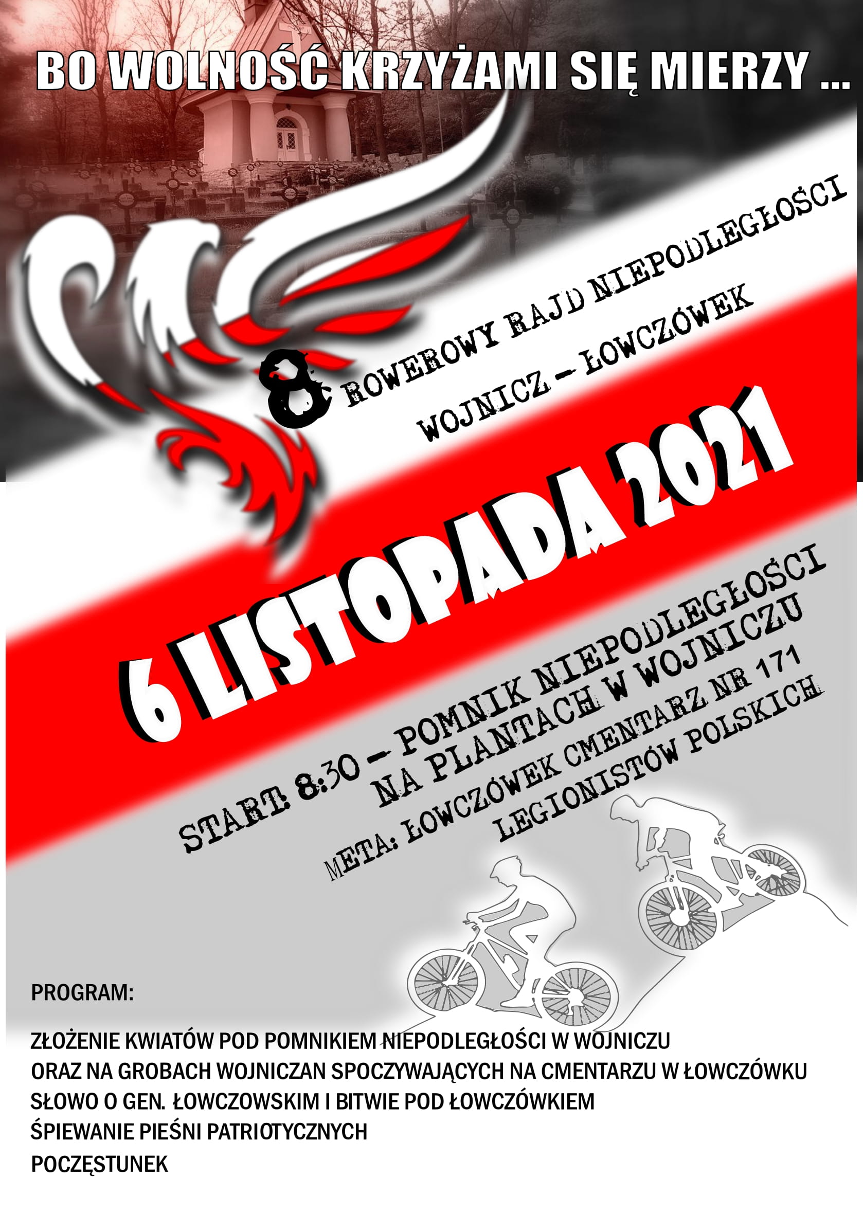 Towarzystwo Przyjaciół Ziemi Wojnickiej zaprasza wszystkich do udziału w VIII ROWEROWYM RAJDZIE NIEPODLEGŁOŚCI WOJNICZ – ŁOWCZÓWEK (6 listopada, sobota). Zbiórka o godz. 8.30 koło pomnika Niepodległości w Wojniczu. Od niepełnoletnich uczestników wymagana jest pisemna zgoda rodziców. Można również przyjechać do Łowczówka samochodem na finał rajdu i spotkanie przy Cmentarzu Legionistów Polskich. Odwiedzamy grób wojniczanina gen. Gustawa Gryf Łowczowskiego oraz groby wojniczan poległych w bitwie pod Łowczówkiem. Spotkanie kończymy wspólnym poczęstunkiem i śpiewaniem pieśni patriotycznych.