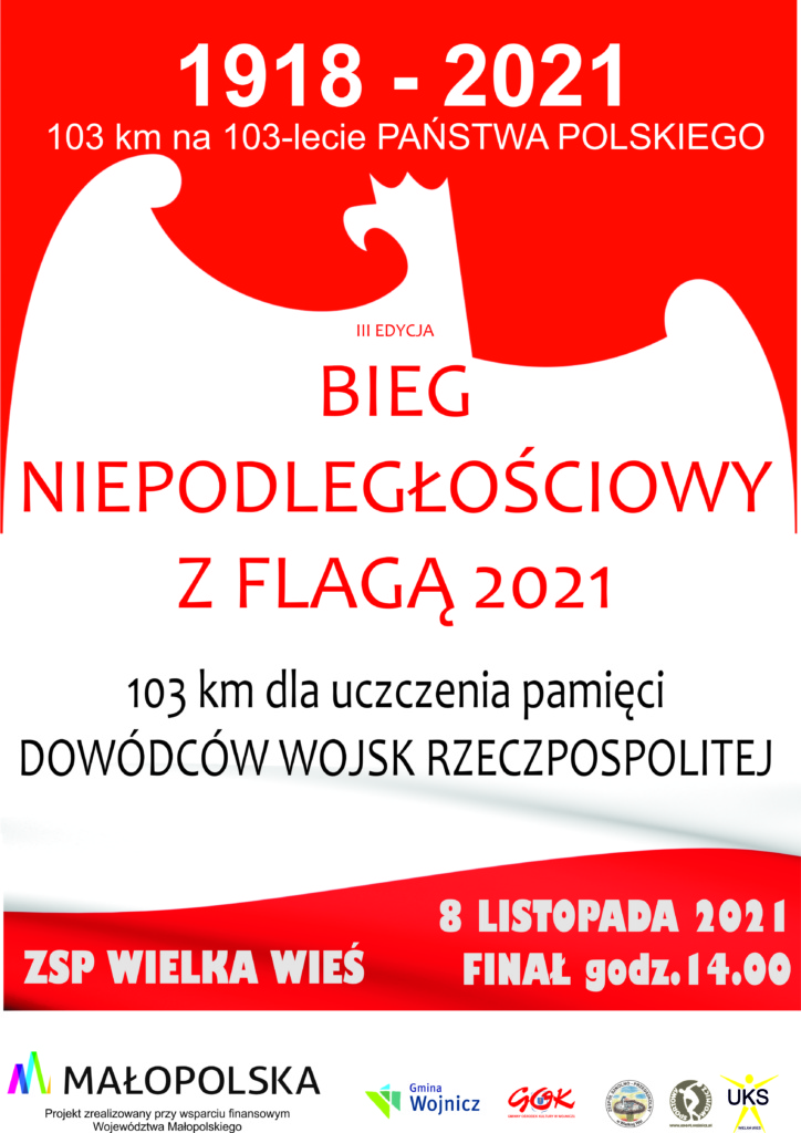 Zapraszamy do uczestnictwa w III edycji Biegu Niepodległości, który odbędzie się 8 listopada 2021r na hali sportowej w Zespole Szkolno – Przedszkolnym w Wielkiej Wsi. Start o godzinie 8.00, a finiszować będziemy około godziny 14.00. Tym razem pobiegniemy 103 km dla uczczenia pamięci DOWÓDCÓW WOJSK RZECZYPOSPOLITEJ. To będzie niesamowita, jedyna i niepowtarzalna sztafeta! Chcemy przebiec 103 km na hali sportowej w sztafecie, gdzie każdy zawodnik przebiegnie część dystansu. Oznacza to, że musimy zrobić 2060 okrążeń! Projekt realizowany przy wsparciu finansowym Województwa Małopolskiego.