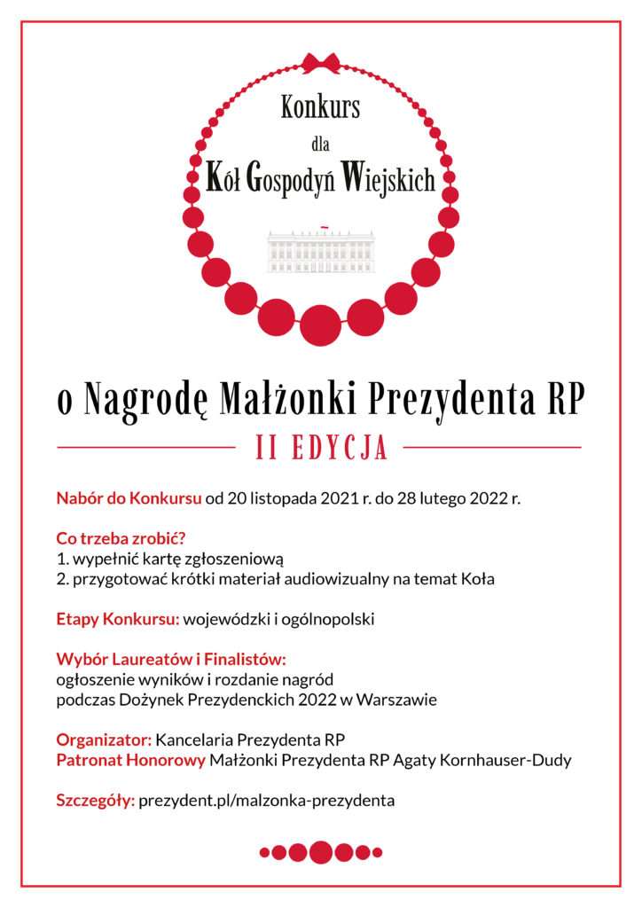 Koła Gospodyń Wiejskich, które zajmą w Konkursie 2. i 3. miejsce, otrzymają okolicznościowe statuetki oraz listy gratulacyjne Małżonki Prezydenta RP.