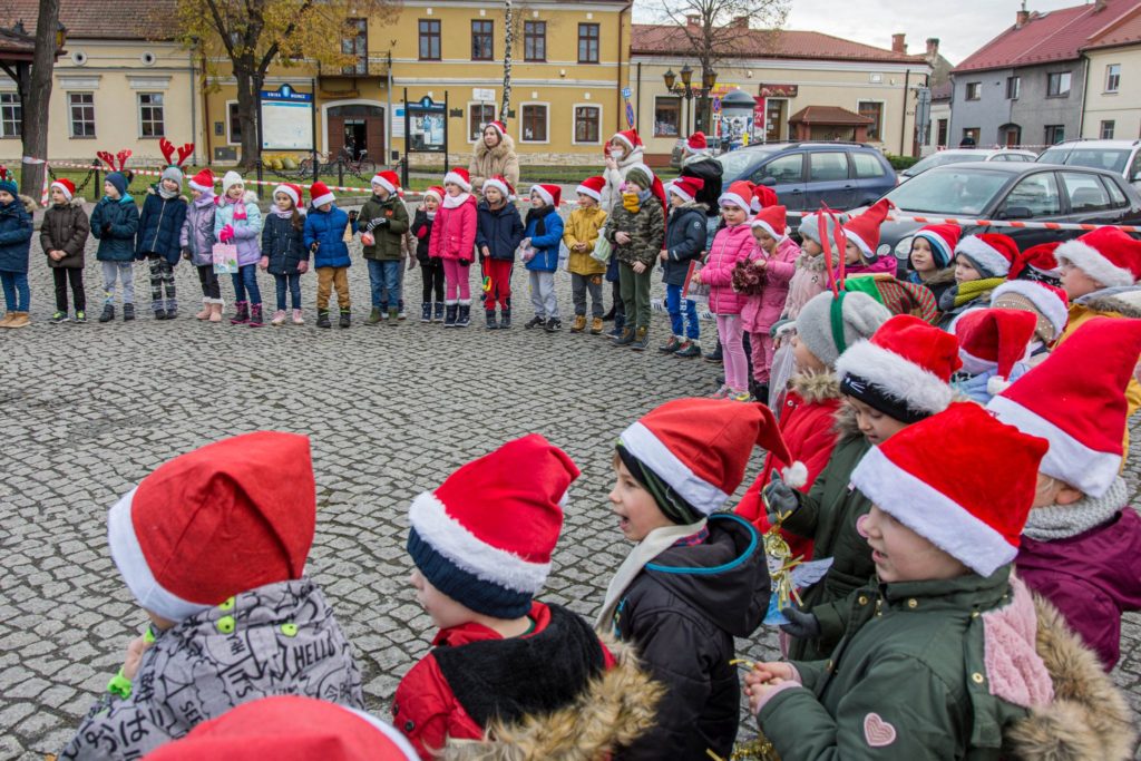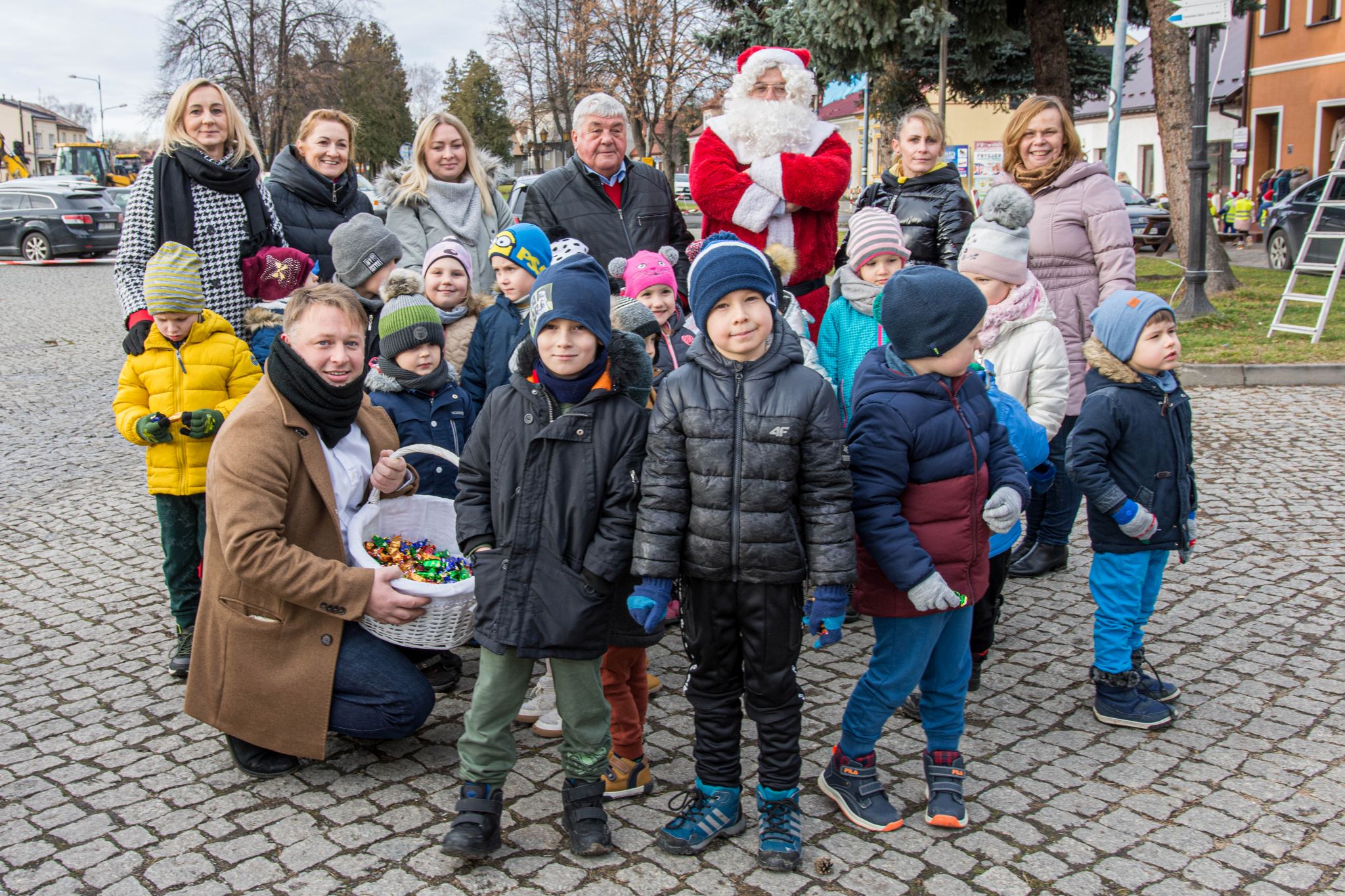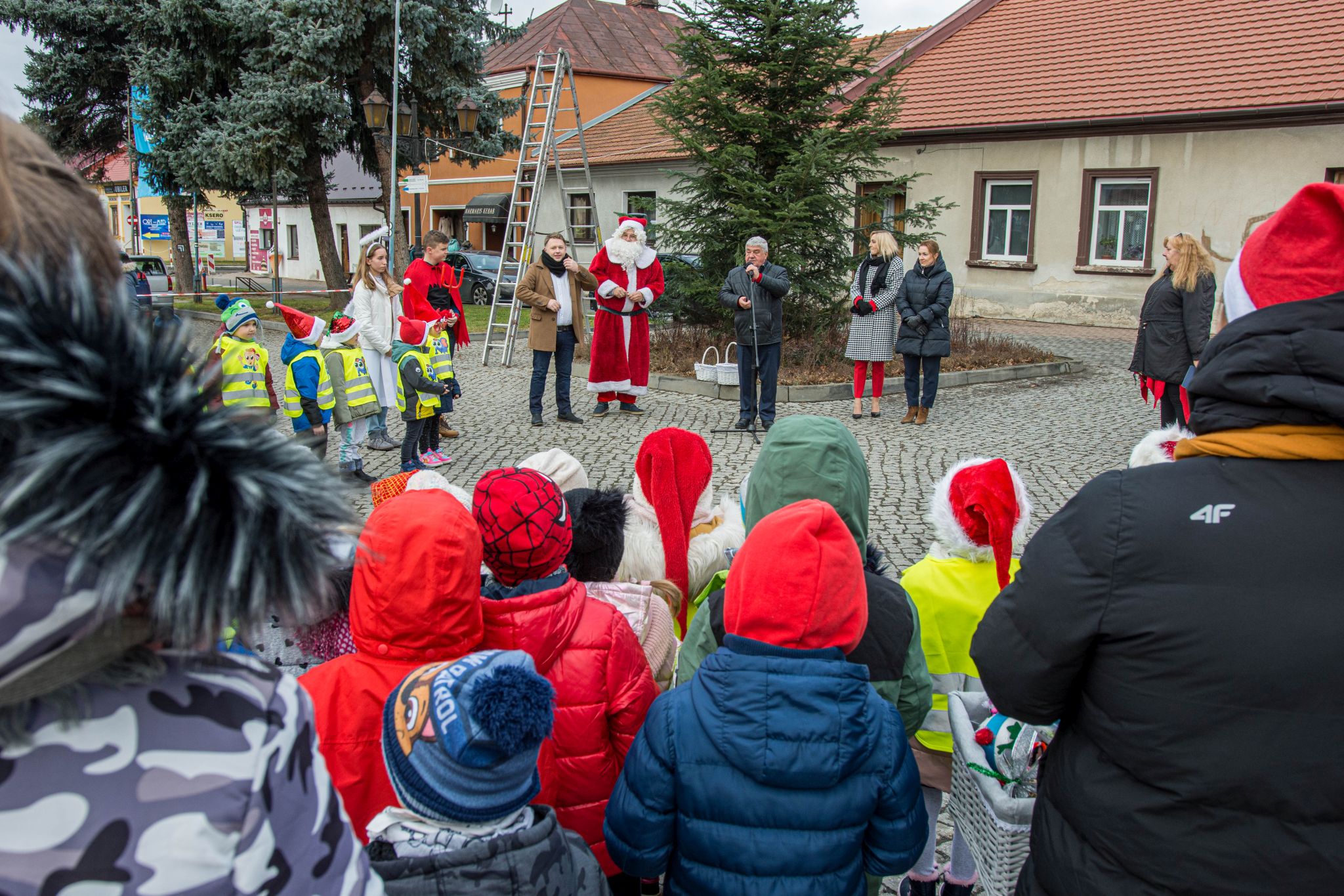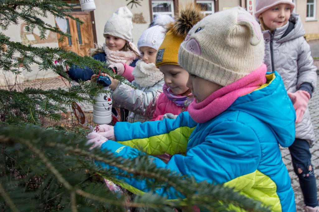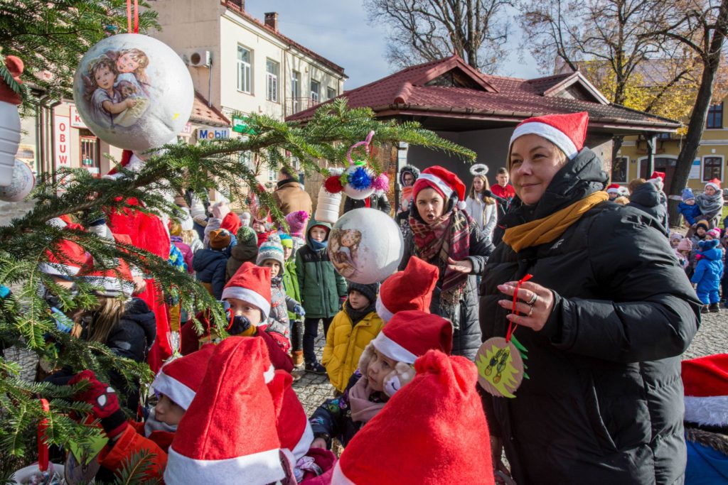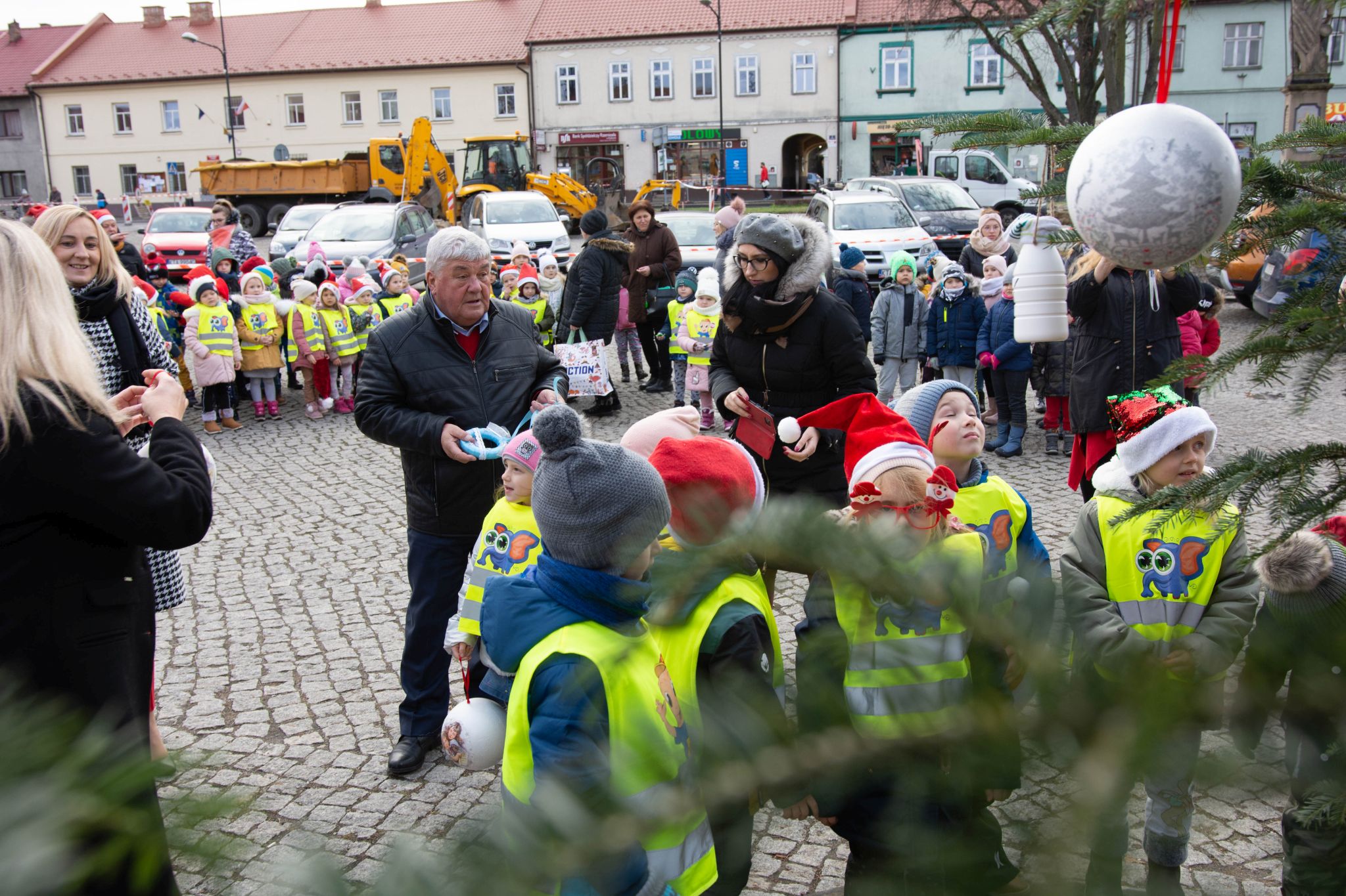 1 grudnia płyta Rynku w Wojniczu przed południem tętniła dziecięcym gwarem. Dzieci z przedszkoli z terenu gminy ubierały stojącą na płycie żywą choinkę. Razem z młodymi mieszkańcami gminy choinkę ubierał Burmistrz Wojnicza Tadeusz Bąk.