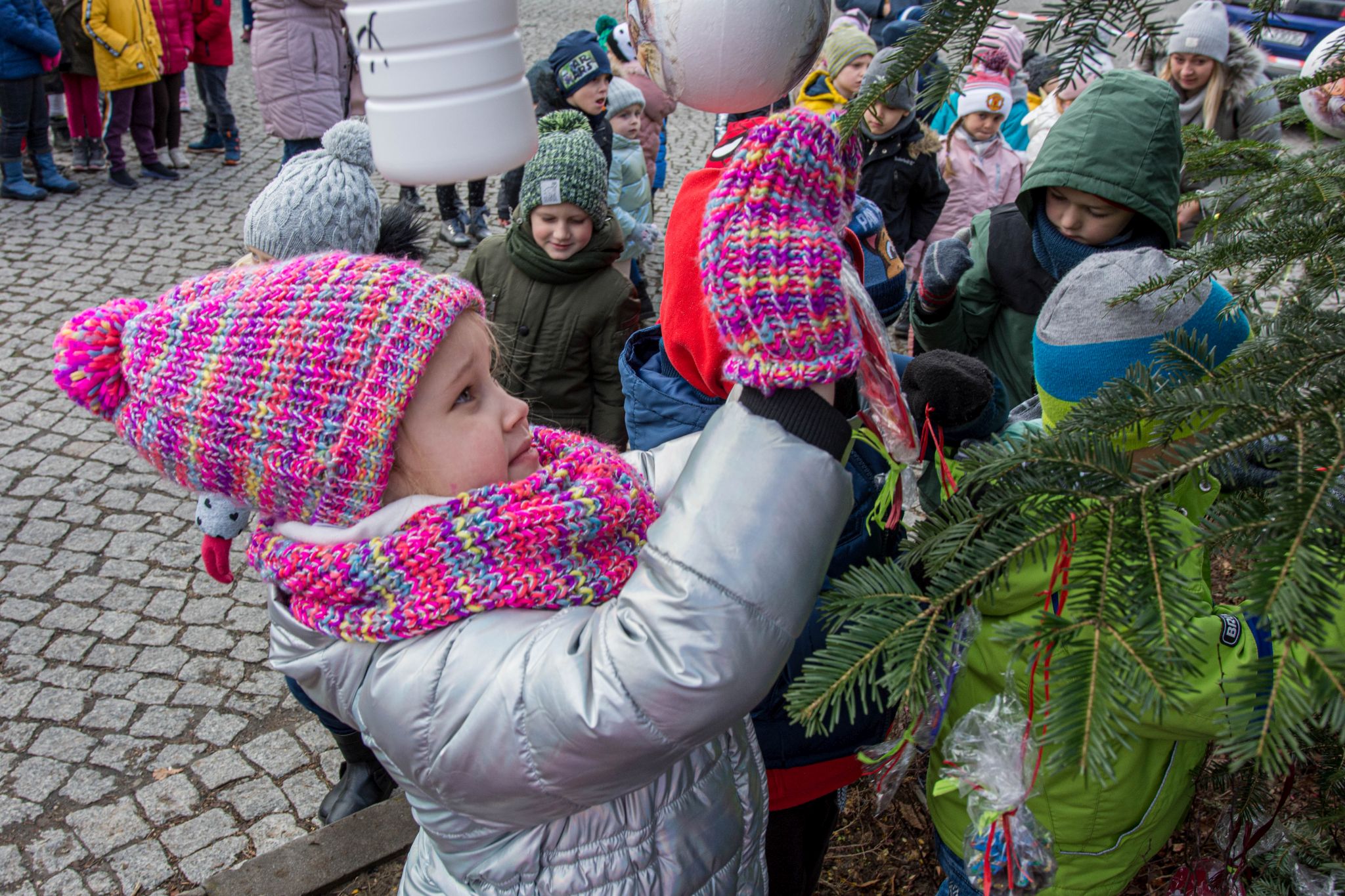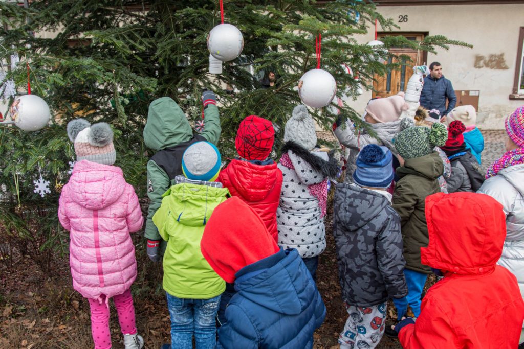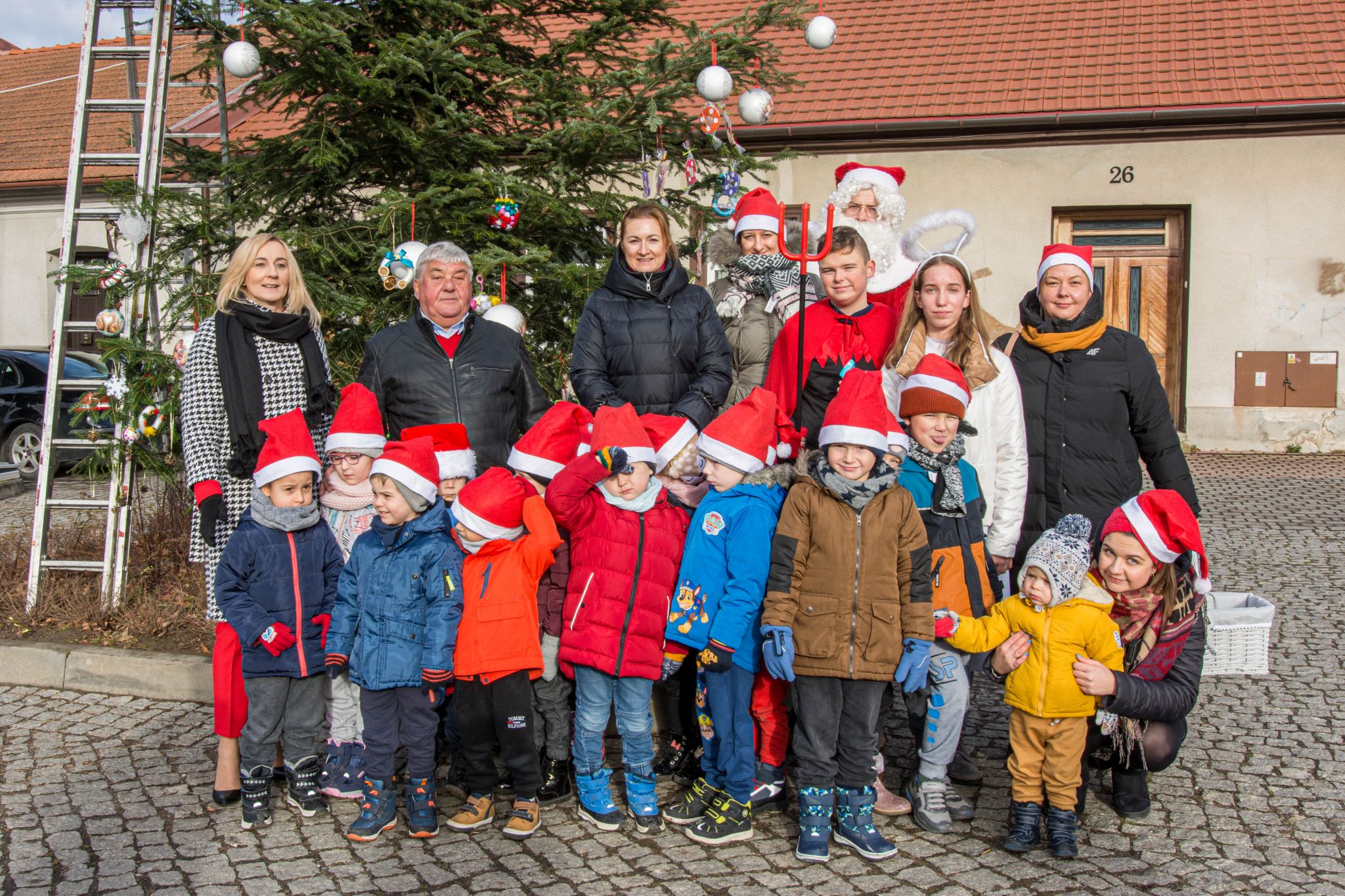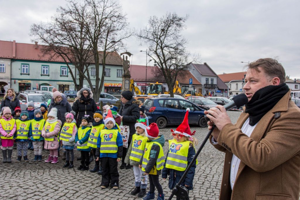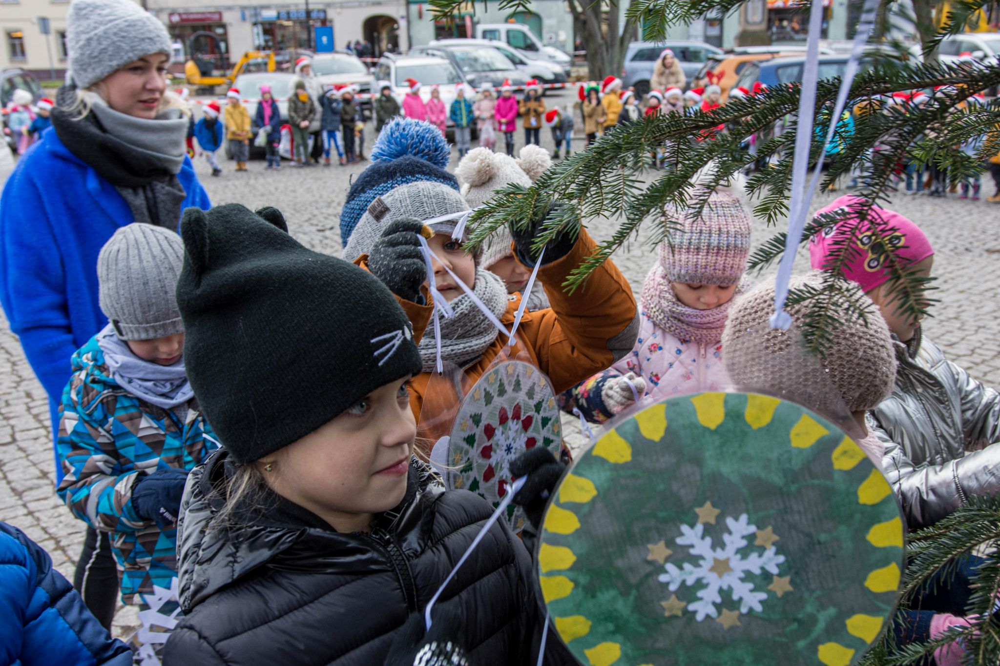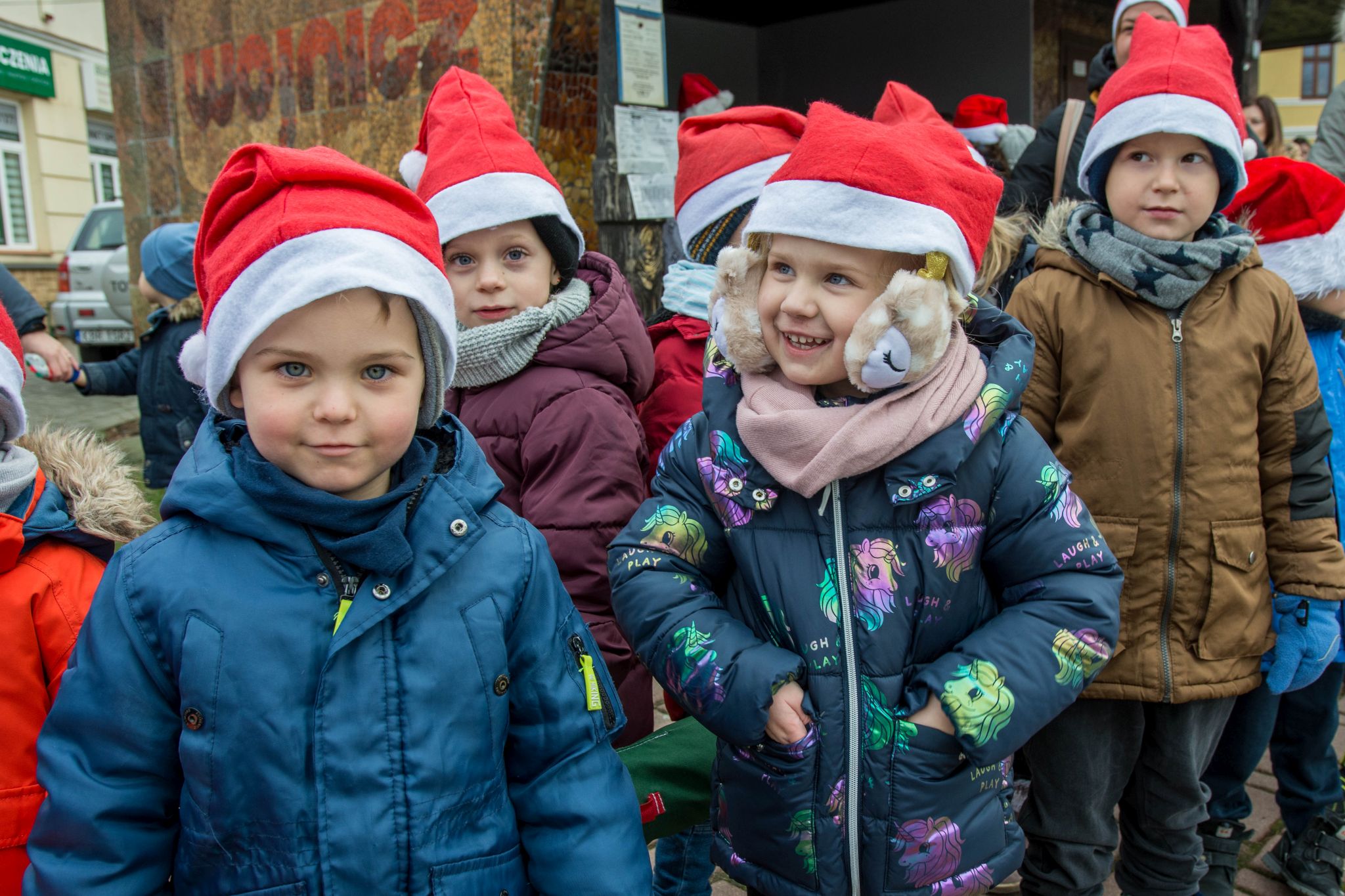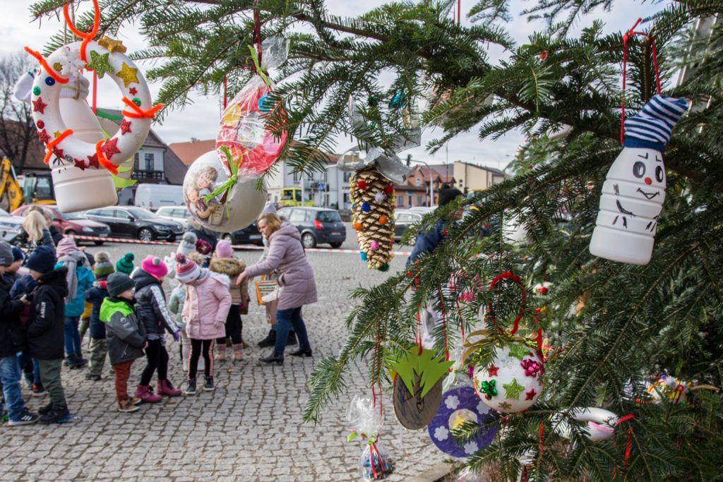 1 grudnia płyta Rynku w Wojniczu przed południem tętniła dziecięcym gwarem. Dzieci z przedszkoli z terenu gminy ubierały stojącą na płycie żywą choinkę. Razem z młodymi mieszkańcami gminy choinkę ubierał Burmistrz Wojnicza Tadeusz Bąk.