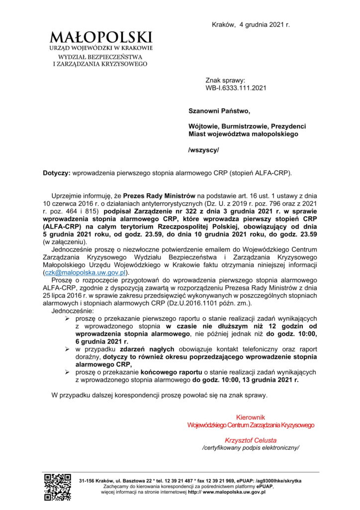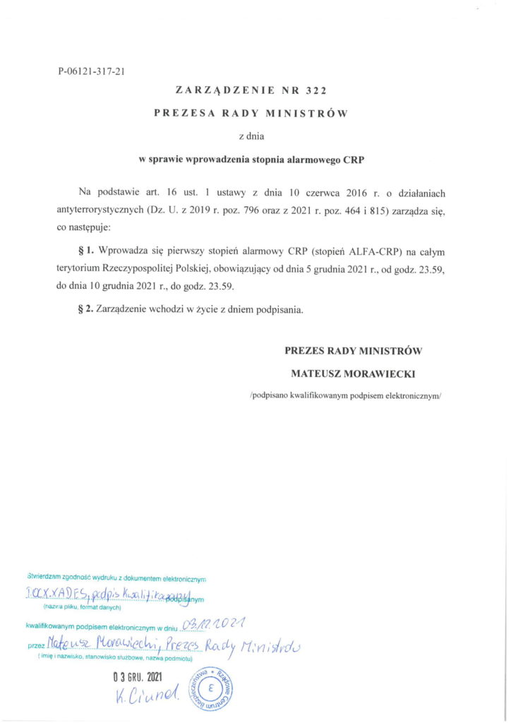 Premier Mateusz Morawiecki podpisał zarządzenie wprowadzające pierwszy stopień alarmowy ALFA-CRP, dotyczący cyberprzestrzeni, na obszarze całego kraju. Stopień alarmowy obowiązuje od niedzieli 5 grudnia 2021 r. (od godz. 23:59) do piątku 10 grudnia 2021 r. (do godziny 23:59). Wprowadzenie stopnia alarmowego ma charakter prewencyjny i jest związane z organizacją Szczytu Cyfrowego ONZ – IGF 2021 (the UN Internet Governance Forum), który odbywa się w Międzynarodowym Centrum Kongresowym w Katowicach.