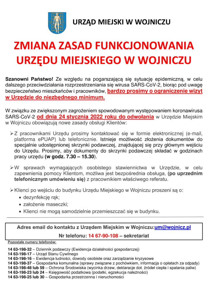 W związku ze zwiększonym zagrożeniem spowodowanym występowaniem koronawirusa SARS-CoV-2 od dnia 24 stycznia 2022 roku do odwołania w Urzędzie Miejskim w Wojniczu obowiązują nowe zasady obsługi Klientów: