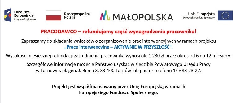 Powiatowy Urząd Pracy w Tarnowie informuje, że posiada środki na realizację prac interwencyjnych w ramach projektu „Prace interwencyjne – AKTYWNIE W PRZYSZŁOŚĆ”.