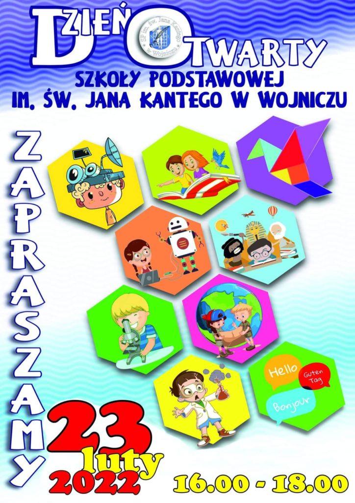 Dyrekcja, Grono Pedagogiczne oraz uczniowie Szkoły Podstawowej im. św.Jana Kantego w Wojniczu zapraszają na dni otwarte szkoły dniu 23.02.2022r.(środa)w godzinach 16.00- 18.00.