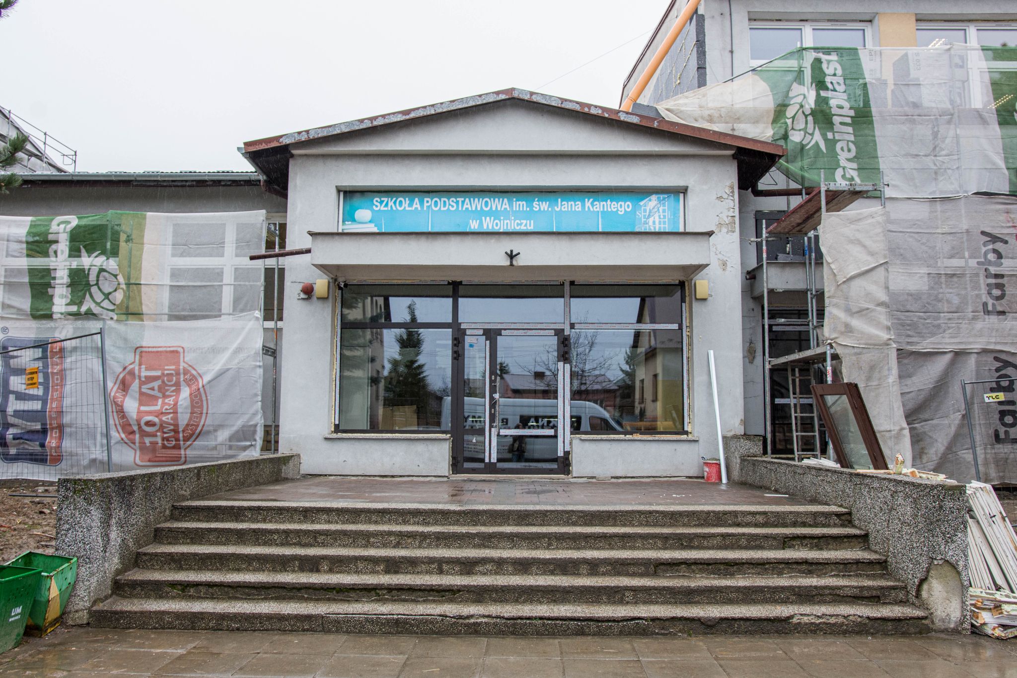 Trwają działania związane z kompleksową termomodernizacją Szkoły Podstawowe w Wojniczu. Prace budowlane nabrały tempa. Postępy widać z dnia na dzień.