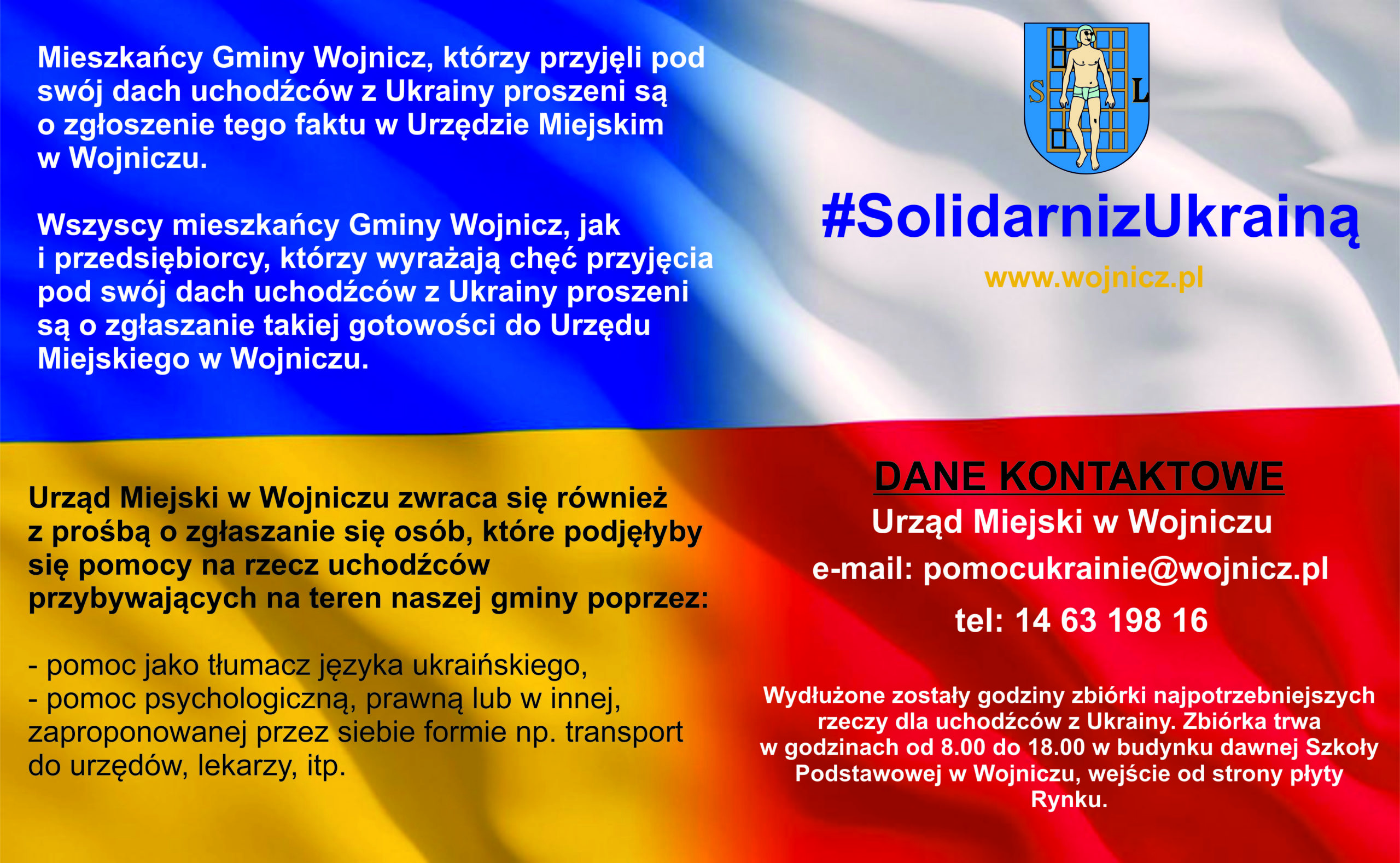 Wszyscy mieszkańcy Gminy Wojnicz, jak i przedsiębiorcy, którzy wyrażają chęć przyjęcia pod swój dach uchodźców z Ukrainy proszeni są o zgłaszanie takiej gotowości do Urzędu Miejskiego w Wojniczu pod nr. tel 14 63 198 16 lub mailowo: pomocukrainie@wojnicz.pl