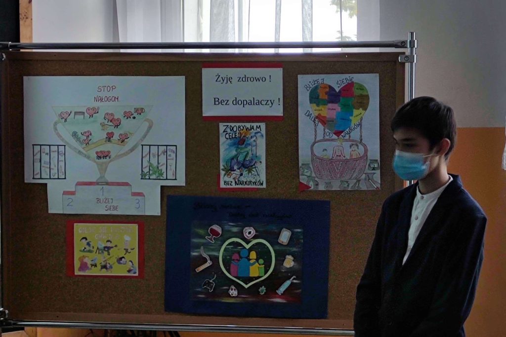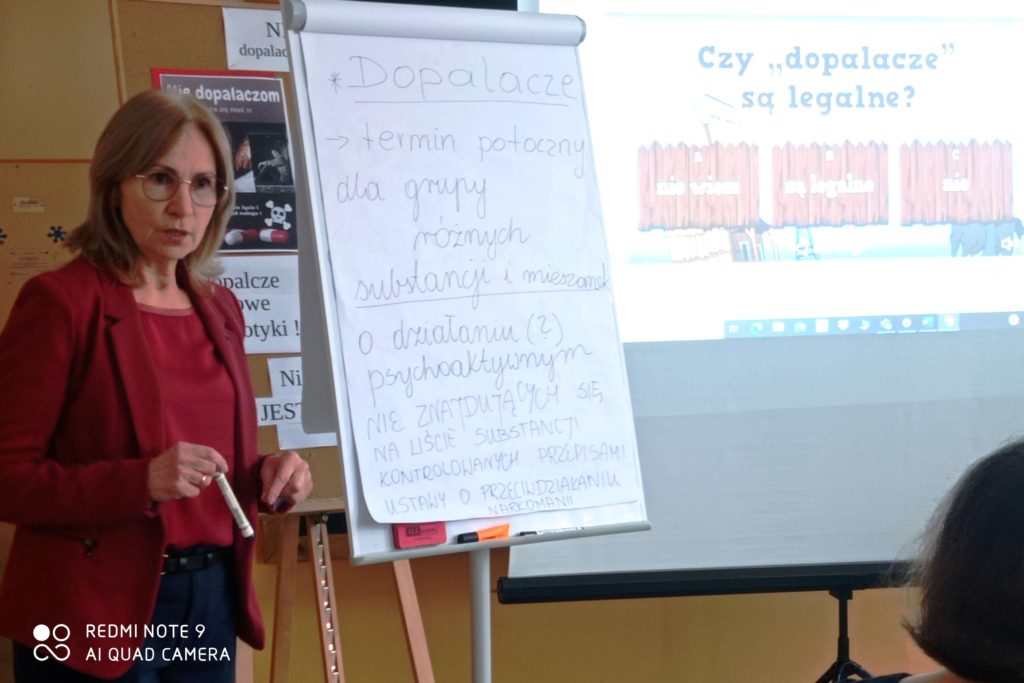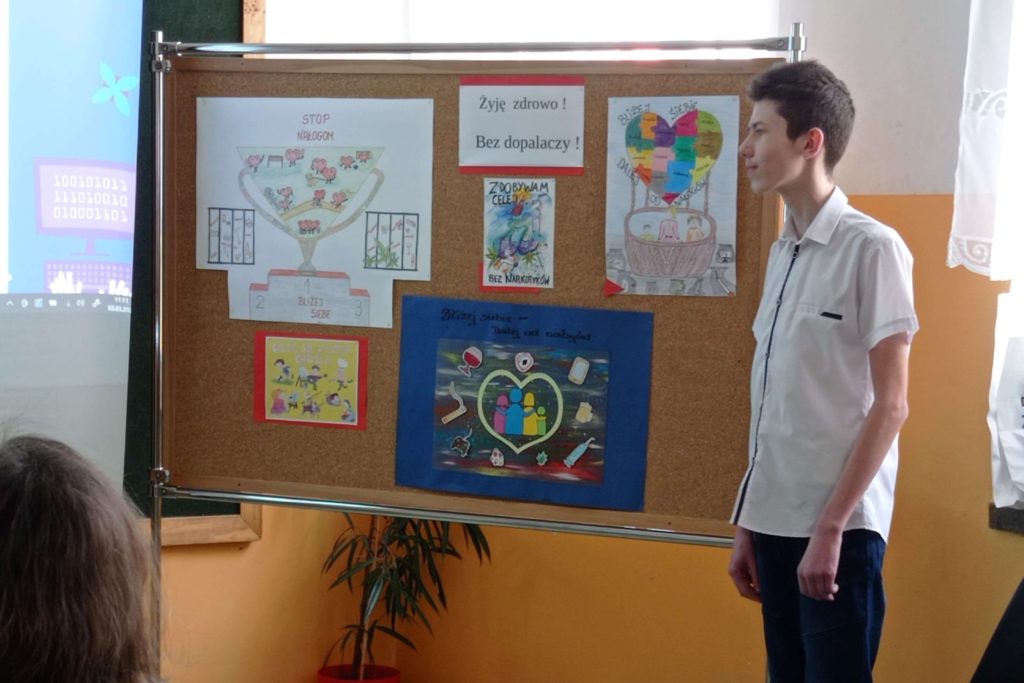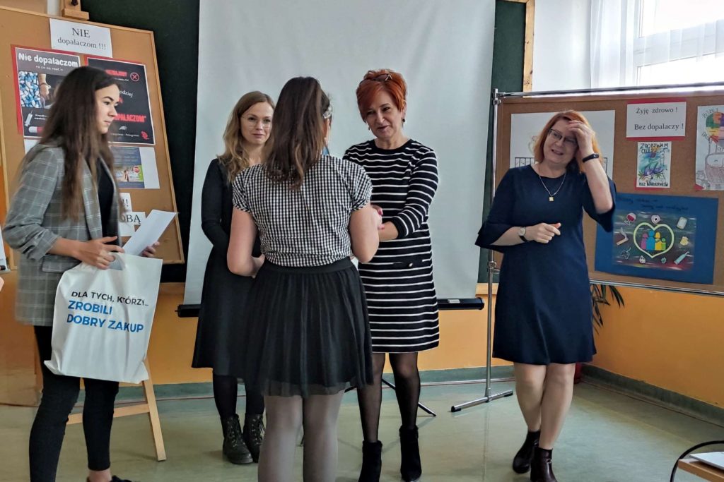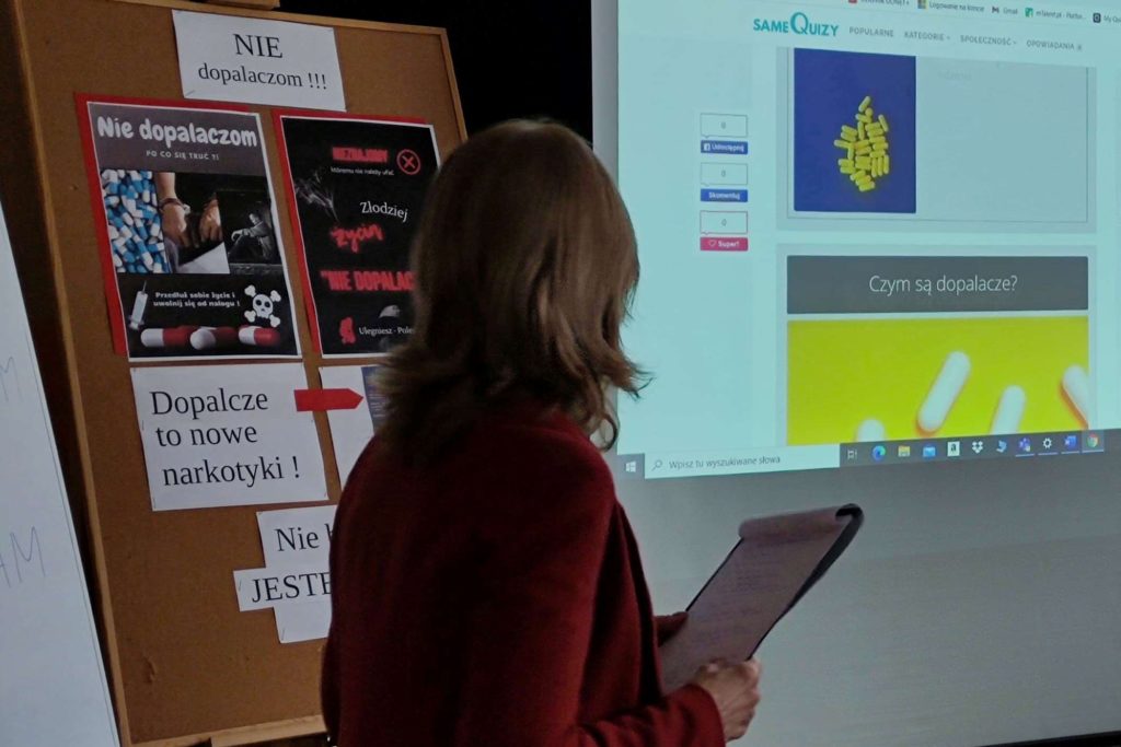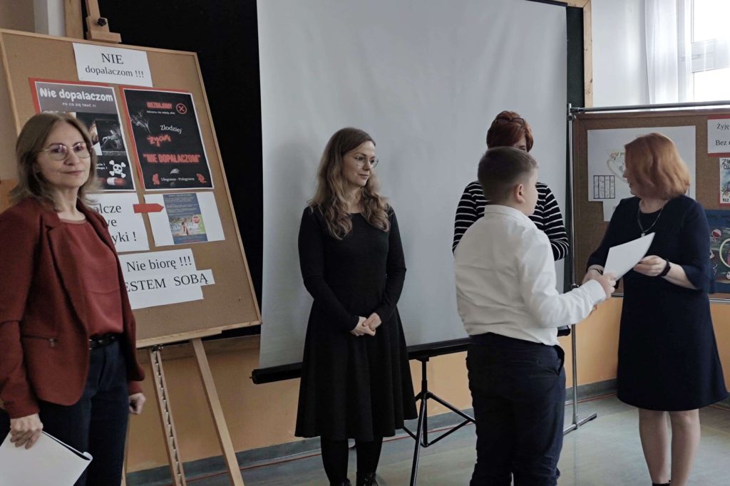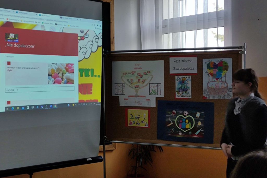 Podczas quasi lekcji, przeprowadzonej przez pedagoga szkolnego p. Ewę Matejską uczestnicy mieli okazję powtórzyć i utrwalić znane wiadomości o dopalaczach, ale także poszerzyć swoją wiedzę w tym zakresie. Podczas tej niby lekcji uczniowie – twórcy testów i quizów złożonych do konkursu wcielili się w role ekspertów, a zebrani mogli sprawdzić własną uważność słuchania odpowiadając na stawiane pytania,z czego aktywnie skorzystali.