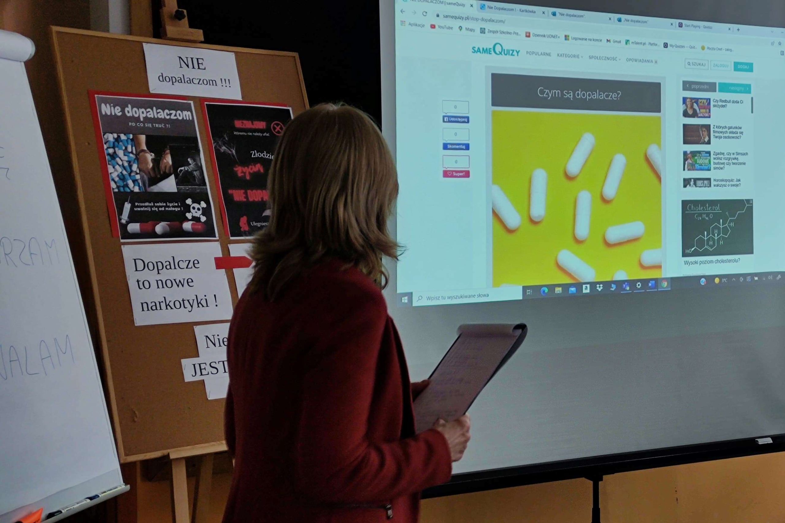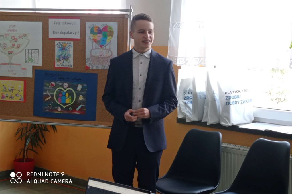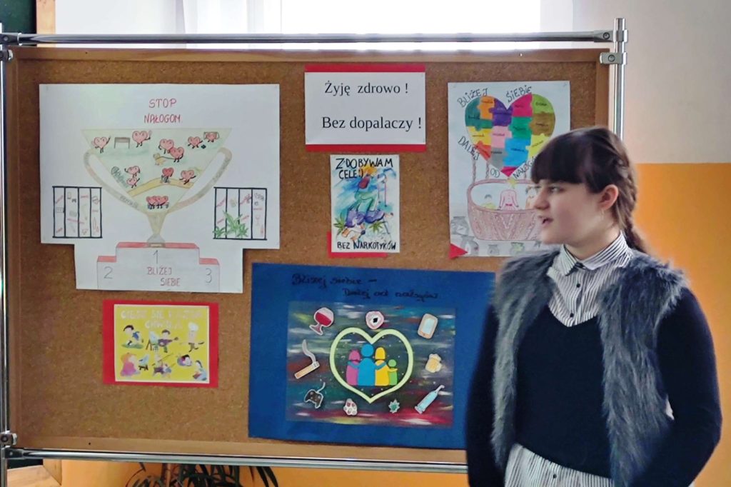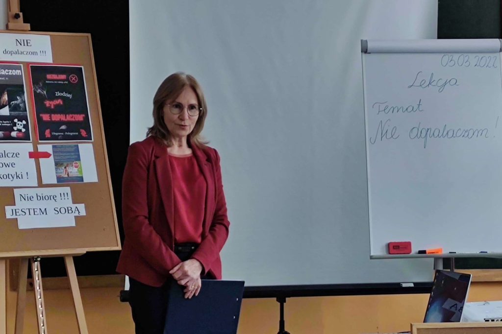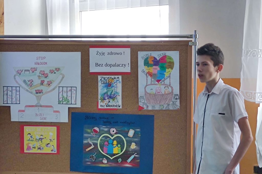 Podczas quasi lekcji, przeprowadzonej przez pedagoga szkolnego p. Ewę Matejską uczestnicy mieli okazję powtórzyć i utrwalić znane wiadomości o dopalaczach, ale także poszerzyć swoją wiedzę w tym zakresie. Podczas tej niby lekcji uczniowie – twórcy testów i quizów złożonych do konkursu wcielili się w role ekspertów, a zebrani mogli sprawdzić własną uważność słuchania odpowiadając na stawiane pytania,z czego aktywnie skorzystali.