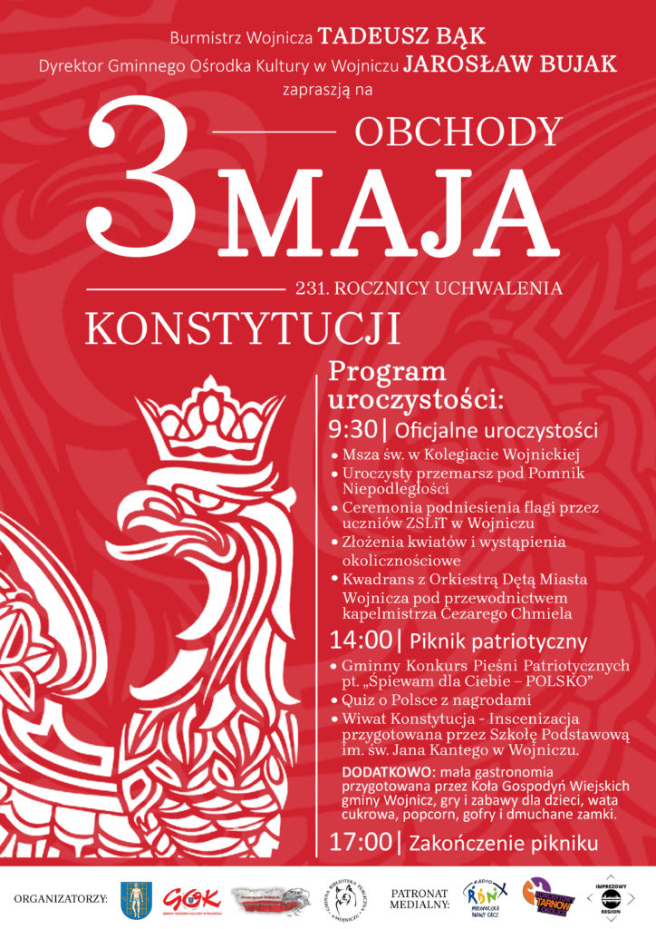 Burmistrz Wojnicza Tadeusz Bąk oraz dyrektor Gminnego Ośrodka Kultury w Wojniczu Jarosław Bujak zapraszają na obchody 231. Rocznicy Uchwalenia Konstytucji 3 Maja, które odbywać się będą w Wojniczu.