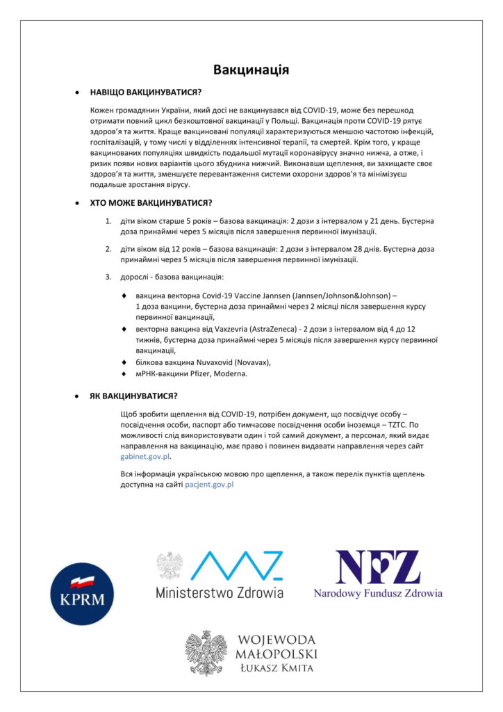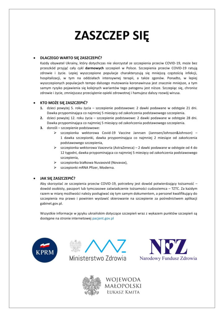 Każdy obywatel Ukrainy, który dotychczas nie skorzystał ze szczepienia przeciw COVID-19, może bez przeszkód przyjąć bezpłatnie cały cykl szczepień w Polsce.