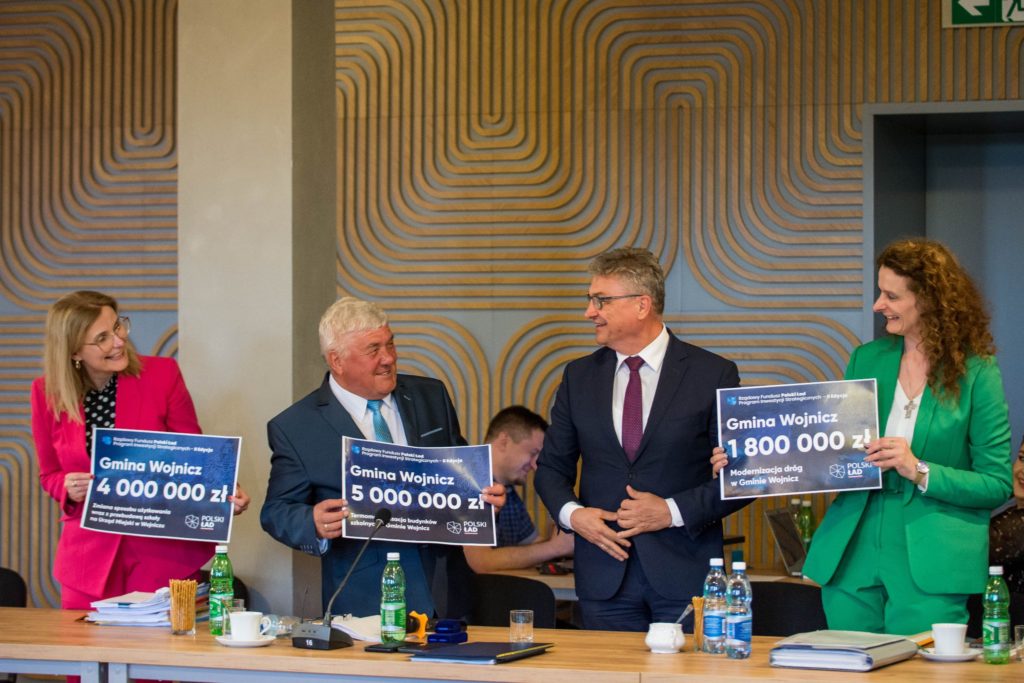 W poniedziałek, 30 maja w Kancelaria Premiera odbyła się konferencja z udziałem premiera Mateusza Morawieckiego, podczas której zostały ogłoszone wyniki drugiego naboru w ramach Rządowego Funduszu Polski Ład: Program Inwestycji Strategicznych. Gmina Wojnicz ponownie otrzymała wysokie dofinansowaniem w kwocie 10,8 mln zł, które zostanie przeznaczone na termomodernizację budynków szkolnych w gminie wraz z zagospodarowaniem terenuw kwocie 5 mln zł. Inwestycja realizowana będzie w budynku Zespołu Szkolno – Przedszkolnego w Olszynach oraz Szkoły Podstawowej w Grabnie. Pozostała część przeznaczona będzie na zmianę sposobu użytkowania wraz z przebudową szkoły na Urząd Miejski w Wojniczu w kwocie 4 mln zł oraz modernizację dróg w gminie w kwocie 1,8 mln zł. Przewidywana wartość wszystkich inwestycji to kwota ponad 12 mln zł, które według planu mają potrwać do końca 2023 roku. Oficjalnego przekazania promesy okolicznościowej dokonał Pan Poseł Wiesław Krajewski podczas sesji absolutoryjnej Rady Miejskiej w Wojniczu, która odbyła się w tym samym dniu.