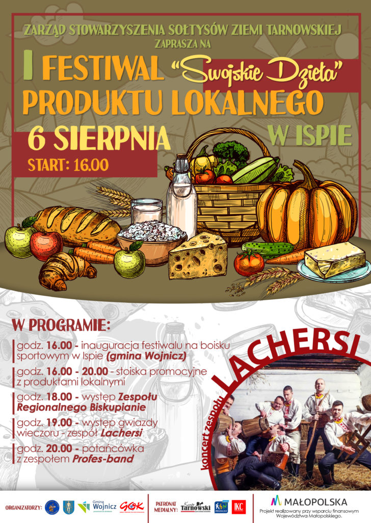 Stowarzyszenie Sołtysów Ziemi Tarnowskiej zaprosiło kilkudziesięciu lokalnych wystawców z terenu powiatu tarnowskiego, aby zaprezentowali swoje wyroby i pochwalili się tym co najlepsze w regionie. Kiermaszowi towarzyszyć będą występy artystyczne z udziałem lokalnych muzyków, degustacje potraw regionalnych w wykonaniu Kół Gospodyń Wiejskich, prezentacja producentów oraz wybór najlepszych na festiwalowej scenie, na której również pojawi się Zespół Ludowy „Biskupianie” oraz gwiazda wieczoru zespół Lachersi. Festiwal zakończy potańcówka z zespołem Profes-band, która zaplanowana została do późnych godzin nocnych.