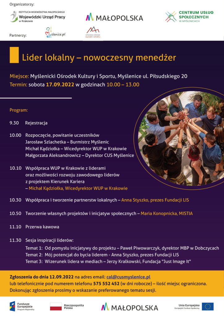 W sobotę 17 września 2022 w godz. 10.00-13.00 w Myślenickim Ośrodku Kultury i Sportu ul. Piłsudskiego 20 w Myślenicach odbędzie się spotkanie pod hasłem „ Lider lokalny- nowoczesny menedżer”.