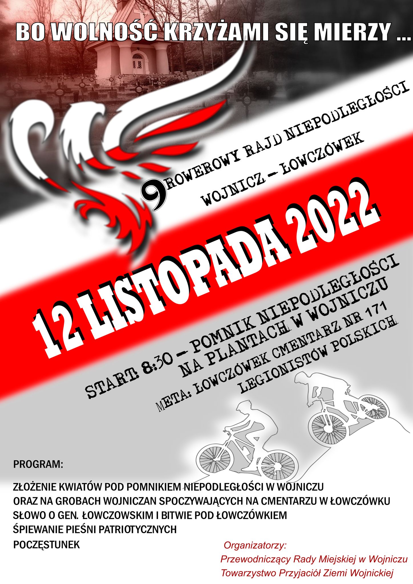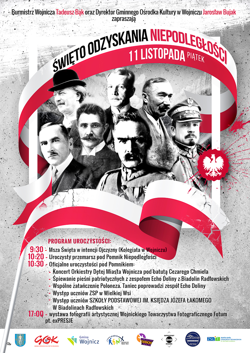 Burmistrz Wojnicza wspólnie z dyrektorem GOK-u Jarosławem Bujakiem serdecznie zaprasza na uroczystości z okazji Narodowego Dnia Niepodległości, które rozpoczną się w o godzinie 9.30 mszą świętą w intencji Ojczyzny. Następnie w uroczystym przemarszu udajemy się pod Pomnik Niepodległości aby złożyć wieńce, kwiaty.