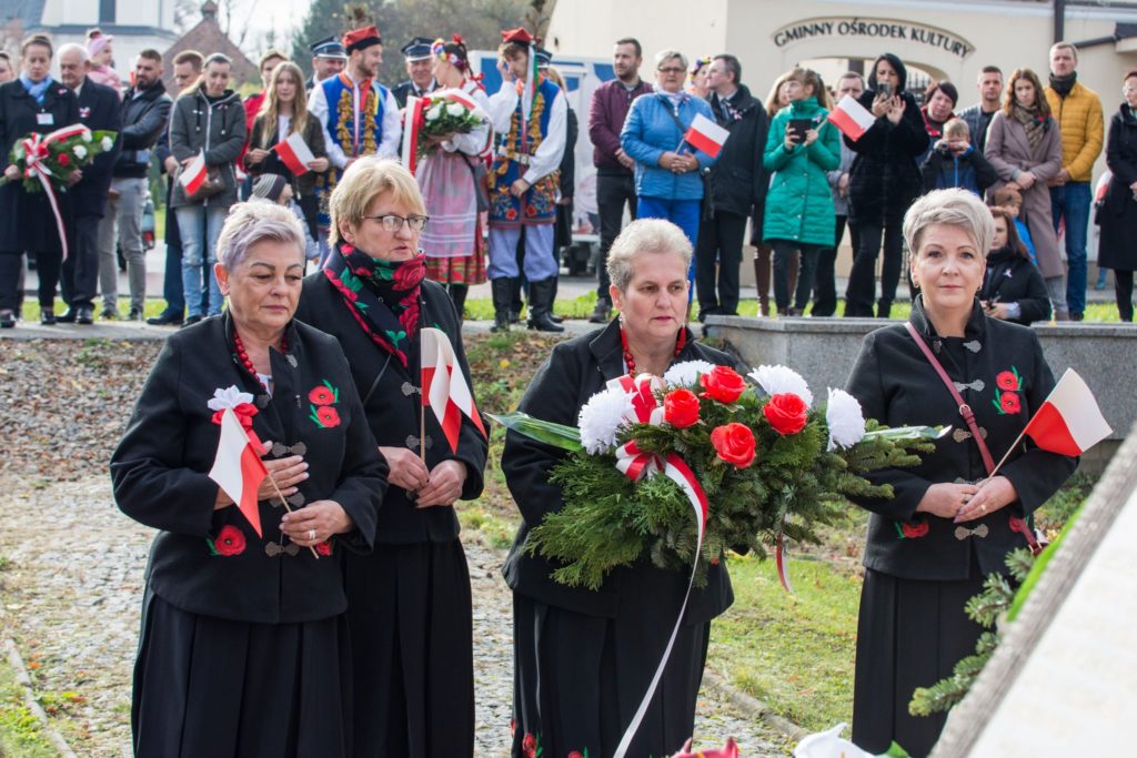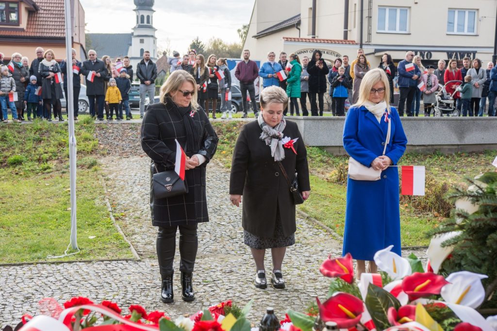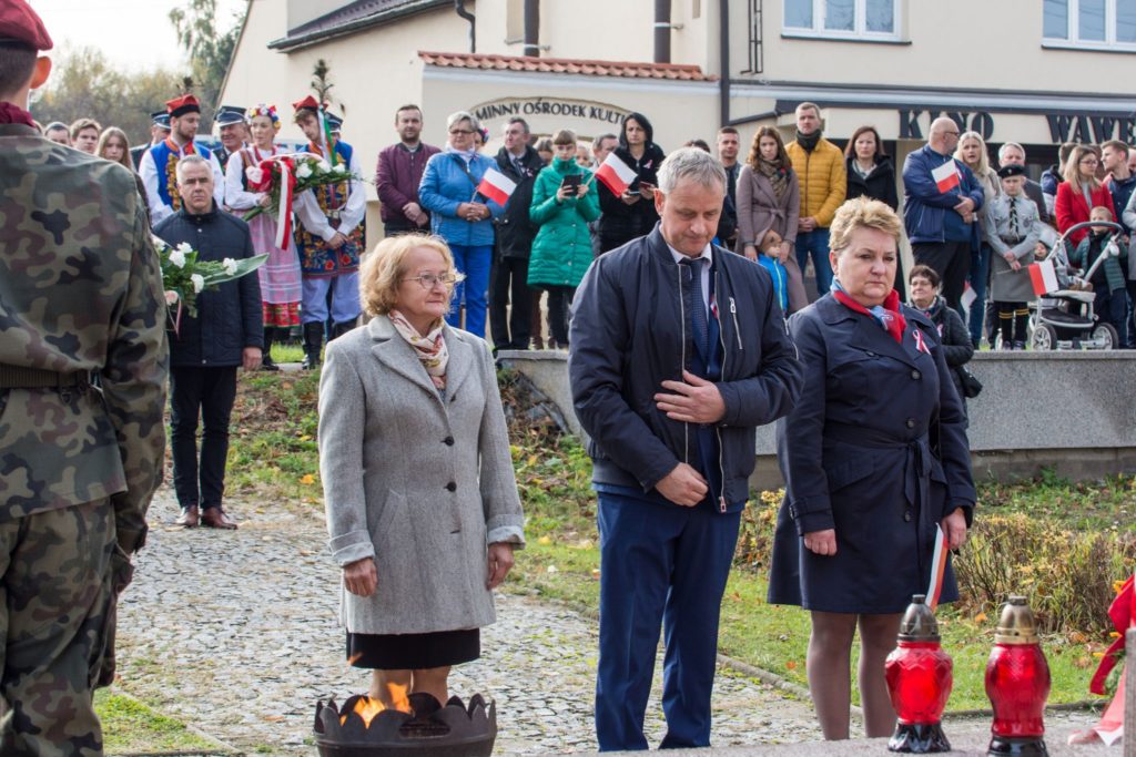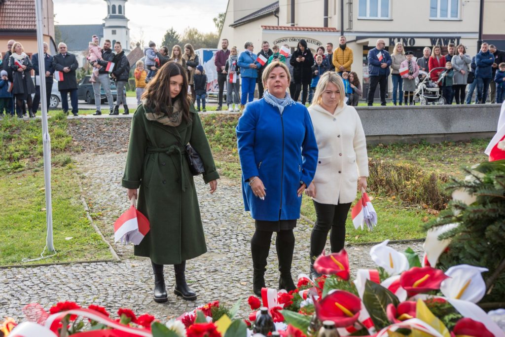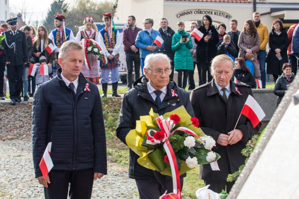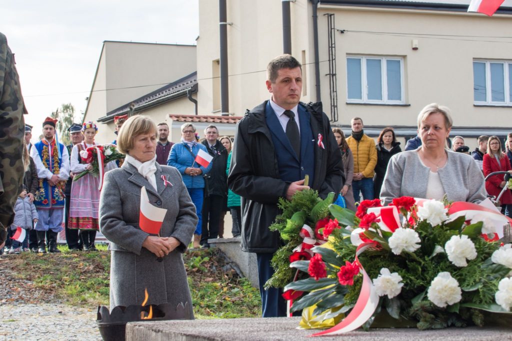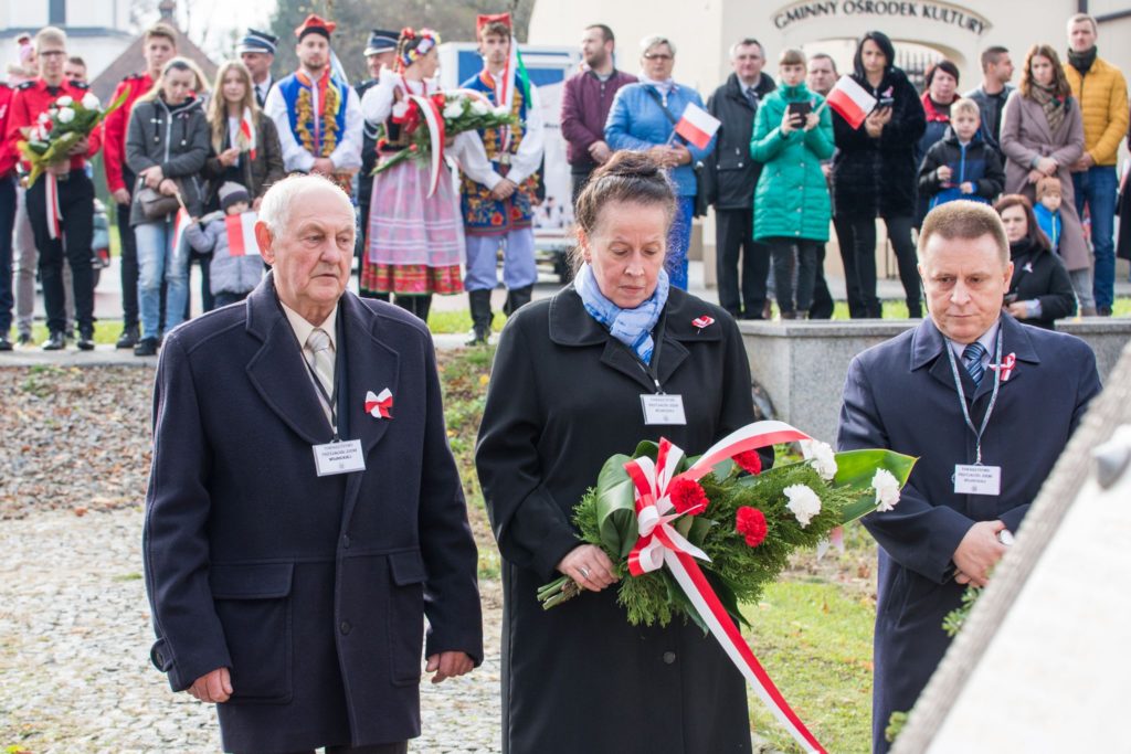 Kończąc przemówienie burmistrz podziękował zebranym za przybycie na uroczystość, a organizatorom, którymi był gminny za przygotowanie gminnych obchodów Święta Niepodległości. Następnie pod pomnikiem wszystkie delegacje złożyły wiązanki kwiatów oraz zapaliły znicze.