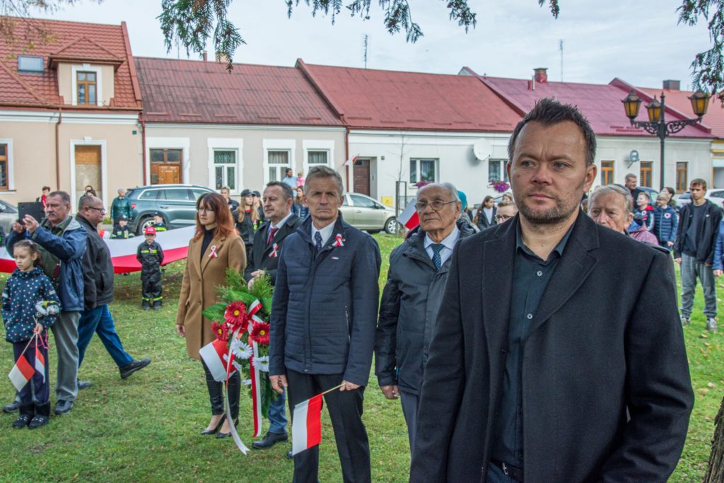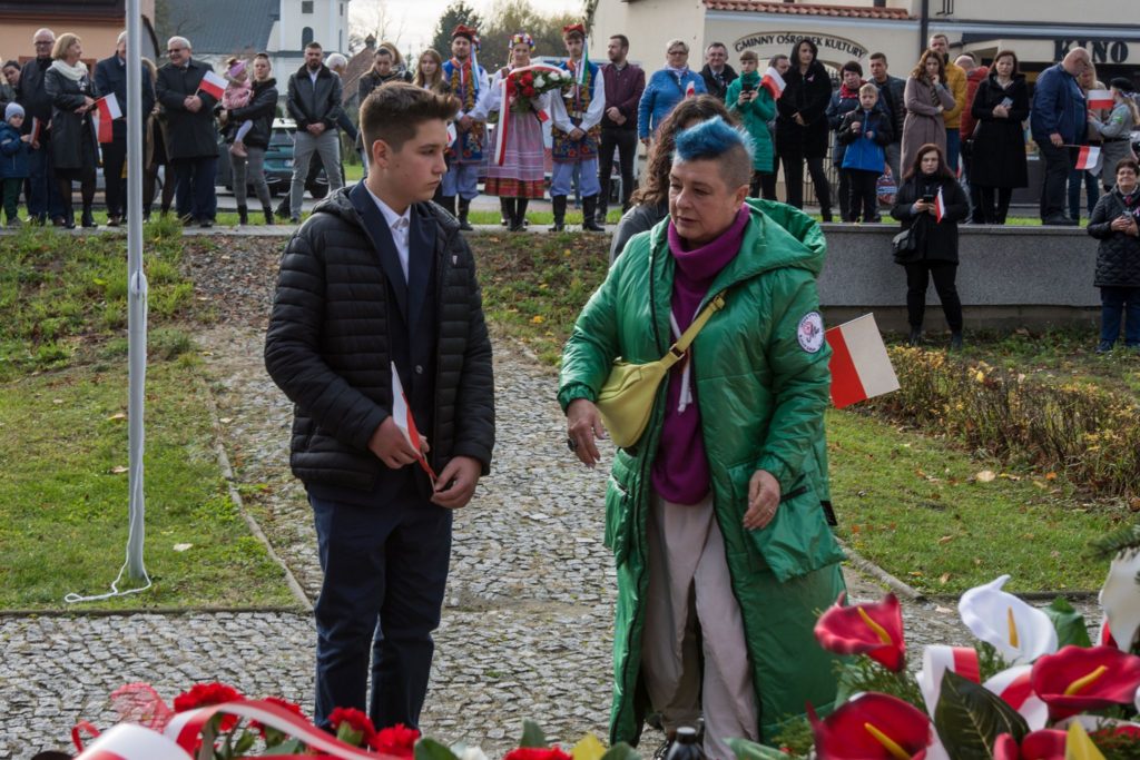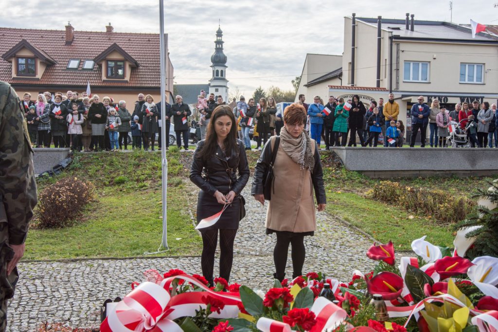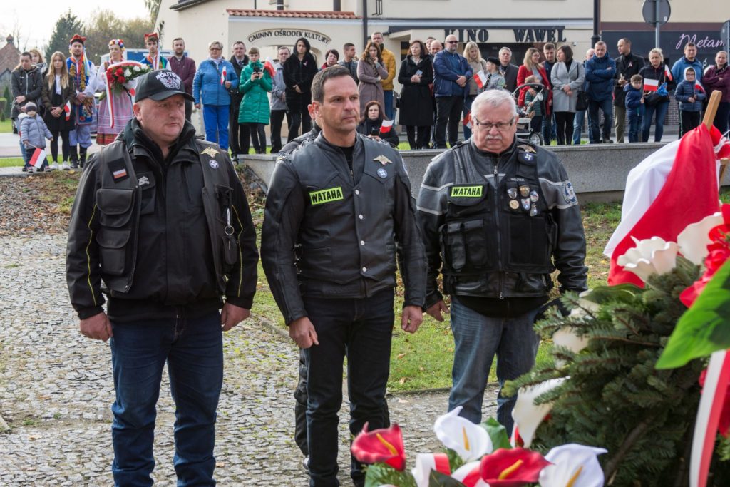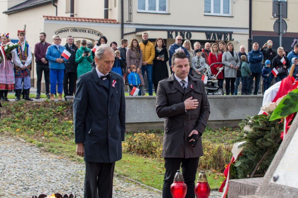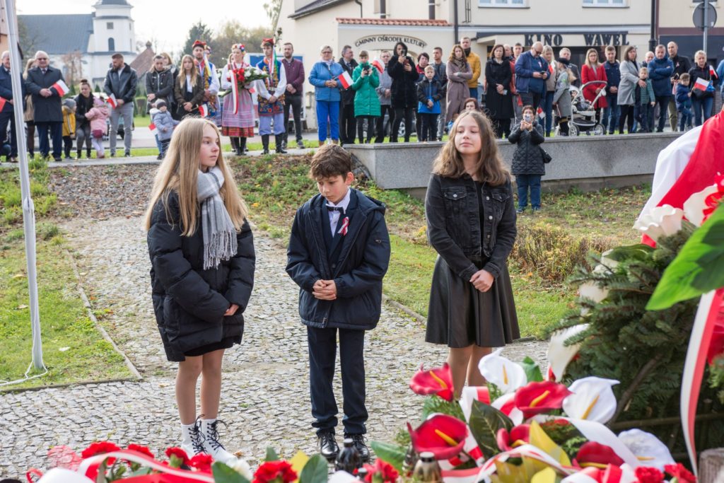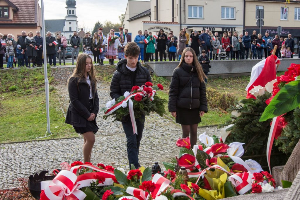 Kończąc przemówienie burmistrz podziękował zebranym za przybycie na uroczystość, a organizatorom, którymi był gminny za przygotowanie gminnych obchodów Święta Niepodległości. Następnie pod pomnikiem wszystkie delegacje złożyły wiązanki kwiatów oraz zapaliły znicze.