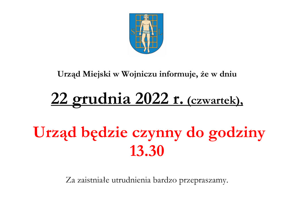 Urząd Miejski w Wojniczu informuje, że w dniu 22 grudnia 2022 r. (czwartek),