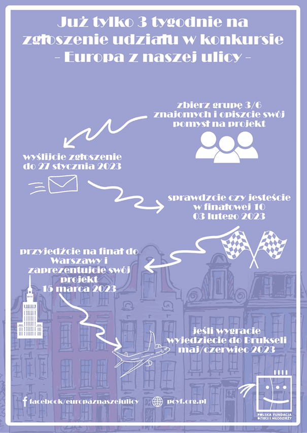 Pozostały już tylko 3 tygodnie na zgłoszenia do piątej edycji konkursu Europa z naszej ulicy dla młodzieży ze szkół ponadpodstawowych. Zgłoszenia przyjmowane są do 27 stycznia. Nagrodą jest wyjazd do Brukseli i spotkanie z europarlamentarzystami. Organizatorem konkursu jest Polska Fundacja Dzieci i Młodzieży.