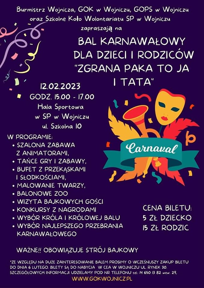 Burmistrz Wojnicza Tadeusz Bąk oraz dyrektor GOK-u Jarosław Bujak serdecznie zapraszają na bal karnawałowy dla dzieci i rodziców w ramach cyklu „Zgrana paka to Ja i Tata”.