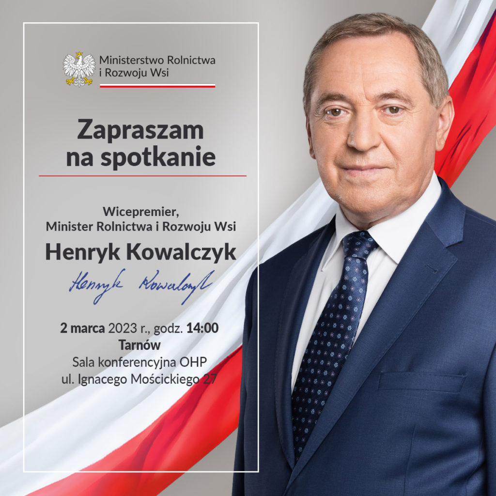 Już w najbliższy czwartek, 2 marca 2023 roku o godzinie 14:00 w Tarnowie odbędzie się spotkanie otwarte z Wicepremierem, Ministrem Rolnictwa i Rozwoju Wsi Henrykiem Kowalczykiem.