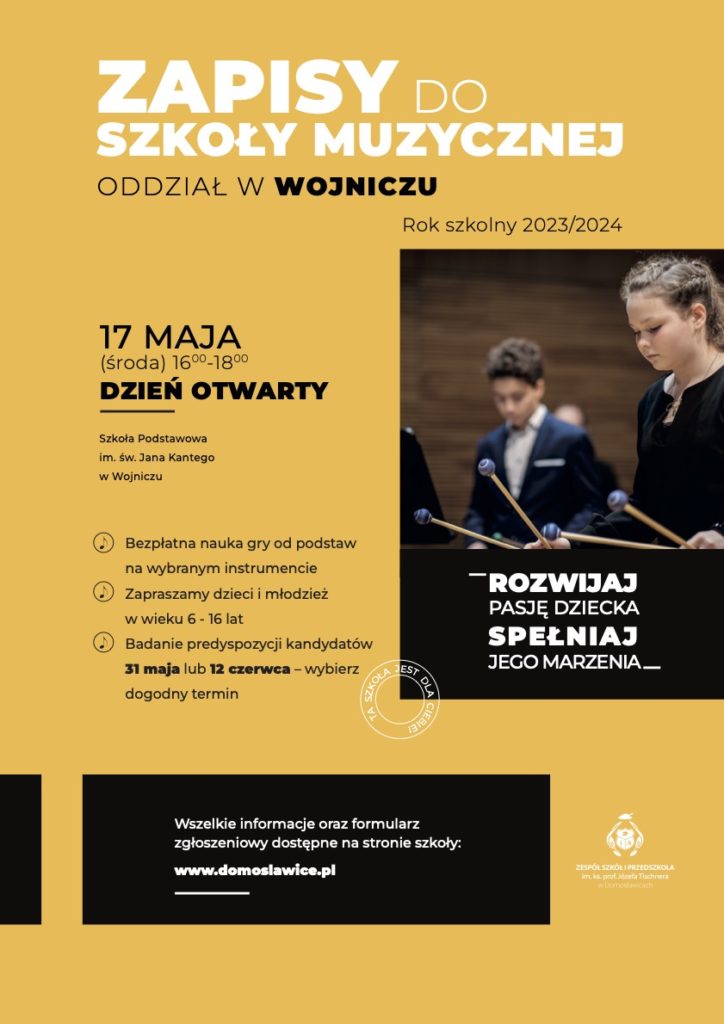 Szkoła Muzyczna I stopnia im. Ks. Prof. Józefa Tischnera w Domosławicach – oddział w Wojniczu prowadzi nabór dzieci i młodzieży na rok szkolny 2023/2024.