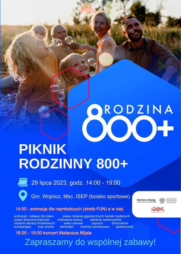 Minister Rodziny i Polityki Społecznej – Marlena Maląg, Wojewoda Małopolski – Łukasz Kmita oraz Burmistrz Wojnicza – Tadeusz Bąk serdecznie zapraszają wszystkich mieszkańców Gminy Wojnicz i okolic, a także gości odwiedzających region tarnowski, do udziału we wspólnej zabawie podczas Pikniku Rodzinnego 800+, który odbędzie się już w najbliższą sobotę (29 lipca) na boisku sportowym w Ispie (gm. Wojnicz).