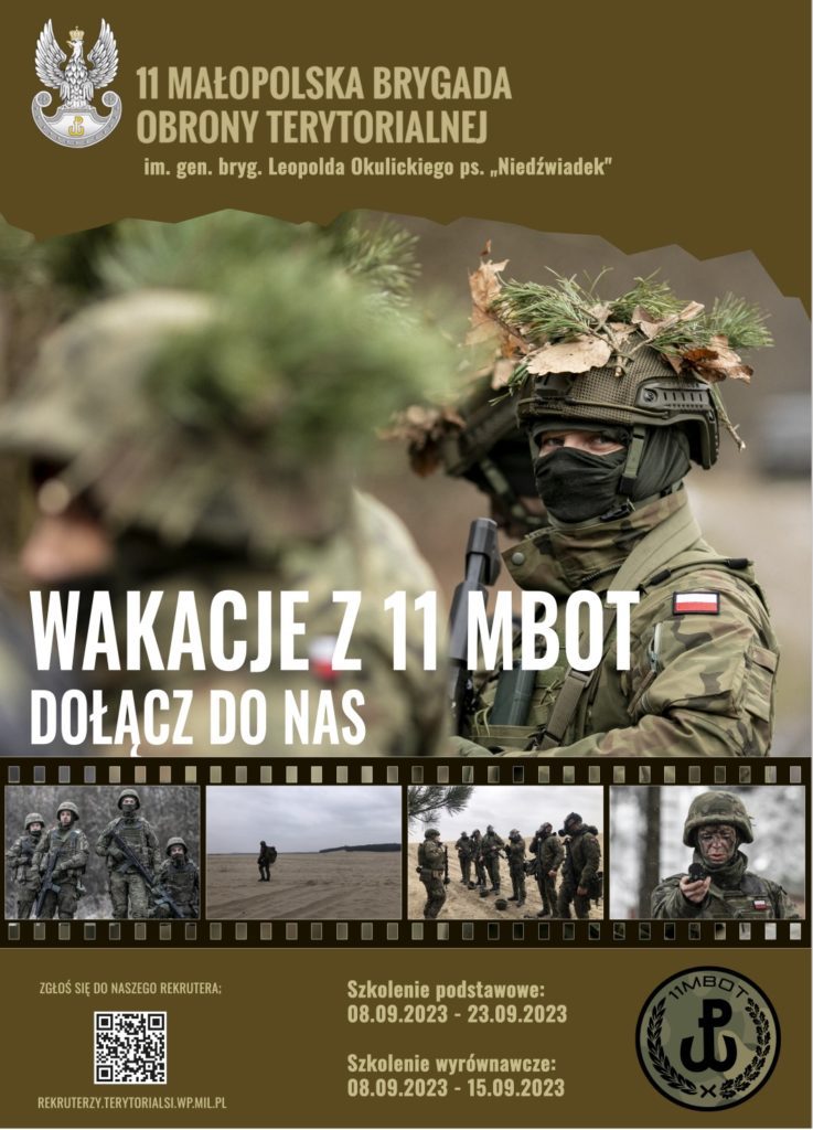 Już za miesiąc dokładnie w piątek 8 września startujemy z kolejnym terminem Wakacji z 11MBOT! Już dziś zachęcamy do zgłaszania się na szkolenia podstawowe 16-dniowe dla osób które nie były jeszcze w Wojsku lub na szkolenia 8-dniowe wyrównawcze dla żołnierzy rezerwy którzy składali w przeszłości Przysięgę Wojskową.