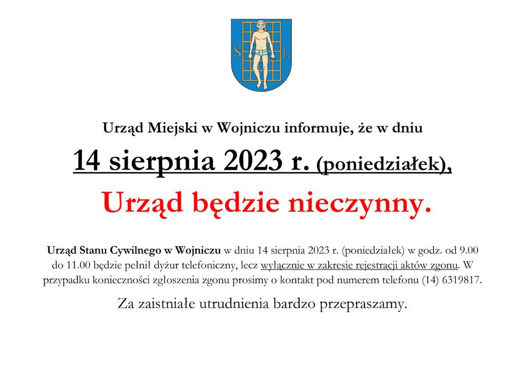 W poniedziałek 14, sierpnia Urząd Miejski w Wojniczu będzie nieczynny. Tego dnia dyżur pełnić będzie Urząd Stanu Cywilnego – w godzinach od 09.00 do 11.00, tel. (14) 6319817.
